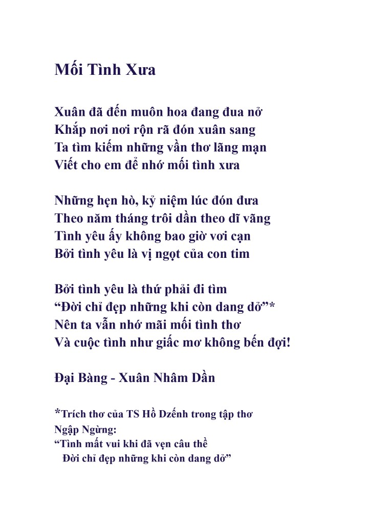| BÀI THƠ XUÂN MỚI Bài thơ Xuân mới viết cho em Nghe tận hư vô nỗi khát thèm Cuội đá còn nguyên đời kết tũa Mà em duyên dáng đứng bên thềm. Bỗng nhiên thức giấc hồn lau sậy Xanh biếc đời Xuân tựa cánh chim Đậu cánh mai vàng hương sắc cũ Lâng lâng giao cảm giữa triền miên. Cho ta dào dạt tim gan mới Xao xuyến từng cơn mạch đất lên Gấm lụa xa hoa vô nghĩa cả Vì em ngà ngọc tựa thần tiên. Trong ta bội phản chưa từng có Dừng lại bên bờ vực tử sinh Xuân đến, lòng ta Xuân mới đến Ru em tình tự mãi say mềm. Đăng Nguyên ( Dòng Mực Tha Hương) |