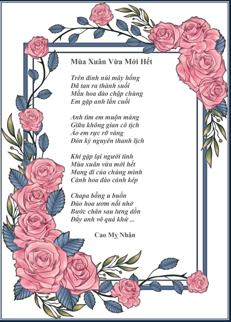 | Mùa Xuân Lữ Thứ Có người nói với em Đã nằm chờ giấc ngủ Thì đừng nghĩ gì thêm Về anh, dù thương nhớ Nhưng mùa xuân đến đó Tình anh vẫn còn đầy Làm sao em ngủ được Khi vắng một vòng tay Anh bảo rằng đắm say Cho em nhiều thi tứ Thì cứ thả thơ bay Theo mùa xuân lữ thứ Anh còn mải bâng khuâng Giữa bao la tình tự Tặng em những mùa xuân Vạn đoá hoa rực rỡ Em mang vào giấc ngủ Một hình ảnh mơ hồ Trong gối chăn ấp ủ Nồng nàn xuân vẩn vơ… Cao Mỵ Nhân |