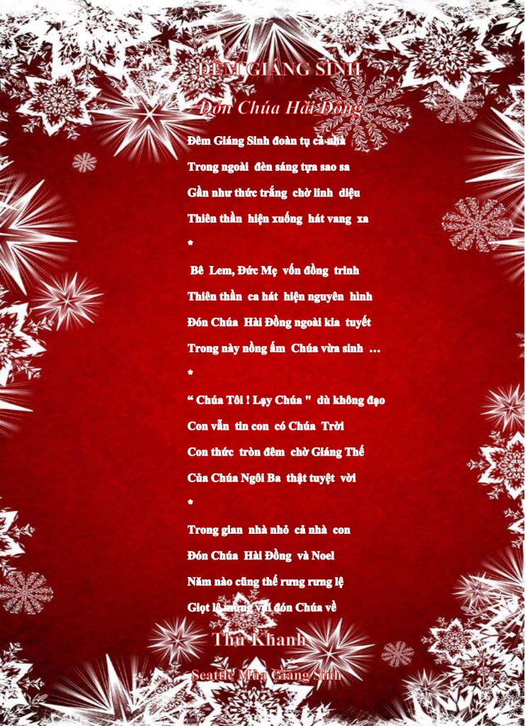 | ĐÊM GIÁNG SINH Đón Chúa Hài Đồng Đêm Giáng Sinh đoàn tụ cả nhà . Trong ngoài đèn sáng tựa sao sa . Gần như thức trắng chờ linh diệu . Thiên thần hiện xuống hát vang xa . * Bê Lem, Đức Mẹ vốn đồng trinh . Thiên thần ca hát hiện nguyên hình . Đón Chúa Hài Đồng ngoài kia tuyết . Trong này nồng ấm Chúa vừa sinh … * “ Chúa Tôi ! Lạy Chúa ” dù không đạo Con vẫn tin con có Chúa Trời Con thức tròn đêm chờ Giáng Thế Của Chúa Ngôi Ba thật tuyệt vời * Trong gian nhà nhỏ cả nhà con Đón Chúa Hài Đồng và Noel Năm nào cũng thế rưng rưng lệ Giọt lệ mừng vui đón Chúa về Thư Khanh Seattle Mùa Giáng Sinh |