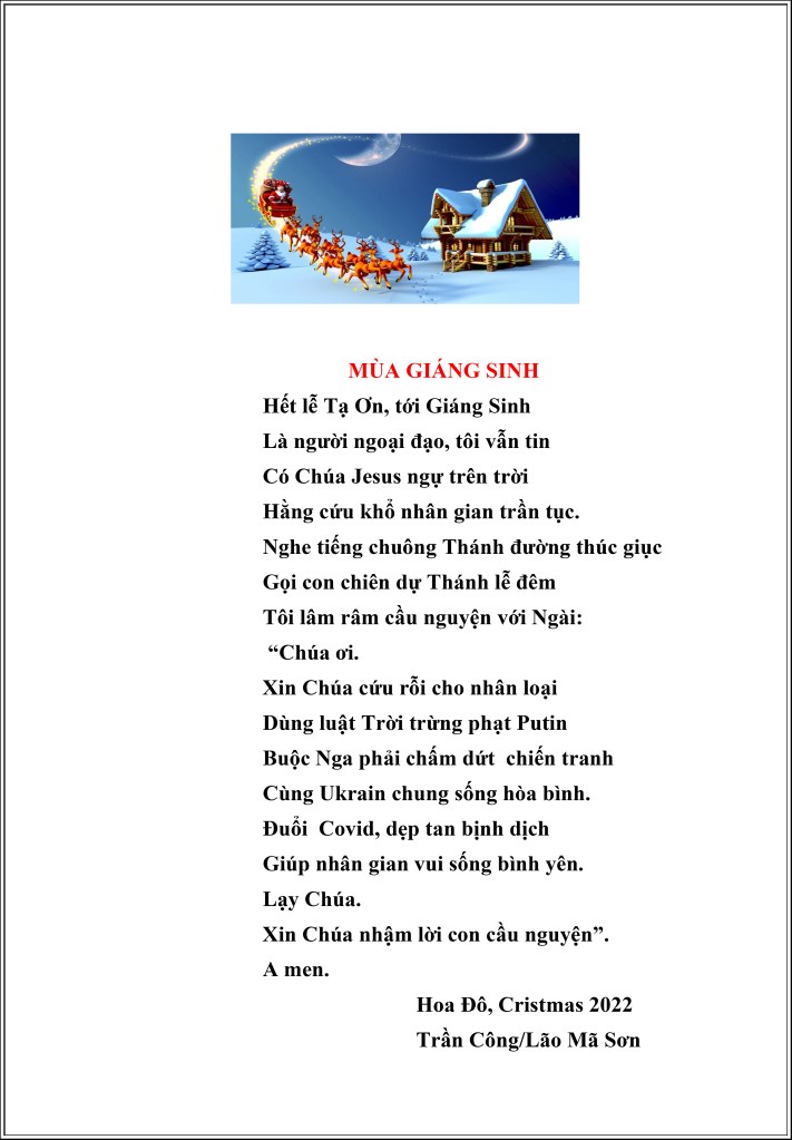 ![]() Tiếng Kinh Cầu Đêm Giáng Sinh Tháng đường chuông ngân vang Tha thiết vọng mây ngàn Bài thánh ca linh hiển Thức tỉnh cả trần gian. Đóng đinh người vô tội Trên thập giá nhục hình Nỗi đau người cúi mặt Khóc thay những tội tình. Chuông vang mừng giáng sinh Cầu Thiên Chúa thánh linh Ban hồng ân nhân loại Hoà bình khắp hành tinh. Trong lời kinh mật khải Người lương thiện điêu linh Ukraine khói lửa Xin Chúa ban hòa bình. Củi đốt trong lò sưởi Ngoài hiên tuyết rơi đầy Cây thông đèn lấp lánh Lòng nguyện ước tràn đầy. Nhạc “Đêm thánh vô cùng” Trong giây phút tưng bừng Đất với trời thánh hoá Ca vang khúc nhạc mừng. Ngân vang những hồi chuông Thức tỉnh cõi vô thường Kiếp nghèo nàn đau khổ Xin Chúa nhủ lòng thương. Trăm năm những đoạn trường Việt Nam còn nhiễu nhương Xoá bạo quyền cộng sản Tự do đời lên hương. Lòng thành kính nguyện cầu Xin Thiên Chúa nhiệm mầu Ban phước lành dân Việt Niềm vui xoá thương đau. Tế Luân 12-16-22 |