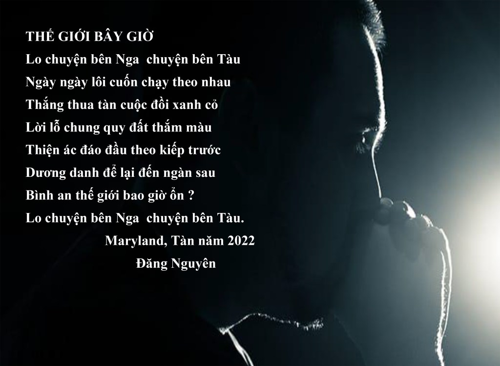 | CẢM ƠN TRỜI Ghi ơn Trời Đất giúp thương ta, Bốn mấy năm qua sống thái hòa. Động đất, tuyết mưa trùm mọi chốn, Cuồng giông, bão lũ, khắp gần xa. Giết người, hôi của, banh bao chỗ, Gây chiến, sát tàn, nát quá đa. Mọi sự yên bình, luôn ấm mát, Nam CA hạnh phúc đẹp muôn nhà. Trời cho phước lộc nên chia xẻ, Giúp đám thương binh cố Cộng Hòa. Mai mốt đổi đời, về họp mặt, Mừng nhau vui hát khúc hoan ca. Đông thiên mưa lạnh, hành quê cũ, Đói rét đau buồn, bệnh tiếp ra, Khó nỗi kiếm ăn, thương tật nhức, Cố cùng, cầu vọng nghĩa trời xa. Đồ Quảng (Dec22) |