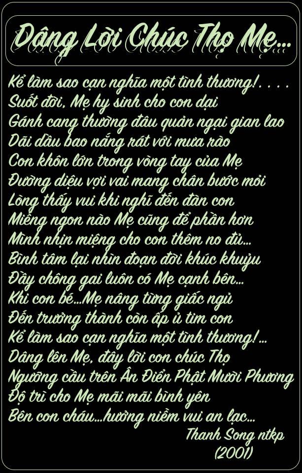 | Mẹ Thương Yêu (1) Khi xưa cá nấu canh bầu Xương da Mẹ rỉa, đuôi đầu Mẹ ăn Nhường con phần thịt ngọt mềm Con ăn một miếng, Mẹ vui Mẹ mừng… Nuôi con đến tuổi thành nhơn Con chưa đền đáp công ơn cao dày Mẹ giờ mình hạc xương mai Mắt mờ chân yếu thân nay mỏi mòn… Mẹ nhìn con đút cháu con Mẹ vui như thuở Mẹ còn thanh xuân Nghĩ mà thấy thẹn với lòng Cù lao chín chữ…con không vẹn toàn !… Thanh Song Kim Phú (D.Ấ.T.G) -15-02-1995 Mẹ Thương Yêu (2) Thuở còn nhỏ…con rắn đầu biếng học Cha răn đe bằng những trận đòn roi Trong ký ức…tuổi thơ hòa nước mắt Và tim con chỉ có Mẹ mà thôi ! Nén tiếng khóc, đỡ đòn con khờ dại Mẹ dịu hiền an ủi chuyện buồn vui Mẹ nhân ái sớt chia từng khổ nhọc Mẹ cam lòng chịu đựng tiếng hờn oan… Con khôn lớn trong vòng tay của Mẹ Con vào đời chập chững bước chông gai Đường trắc trở, tuổi con còn quá trẻ Đã sớm vương…mối nợ của trần ai… Trong hạnh phúc, niềm vui con riêng hưởng Lúc khổ đau…tìm đến Mẹ thở than Tay rộng mở, Mẹ ôm con âu yếm Rồi lựa lời…kiếm cách để khuyên can… Hình bóng Mẹ theo con từng năm tháng Tuổi trẻ qua mau bổng chốc chợt già Tình yêu đã sớm cằn khô lạnh giá Một kiếp người…rồi cũng sẽ phôi pha ! Bình tâm lại, nhìn đoạn đời khúc khuỷu Đầy gai chông…luôn có Mẹ cạnh bên Con thơ dại…Mẹ nâng từng giấc ngủ Đến trưởng thành…còn ấp ủ tim con… Kể làm sao…cạn nghĩa một tình thương ! Thanh Song Kim Phú (D.Ấ.T.G)-30-03-1995 |