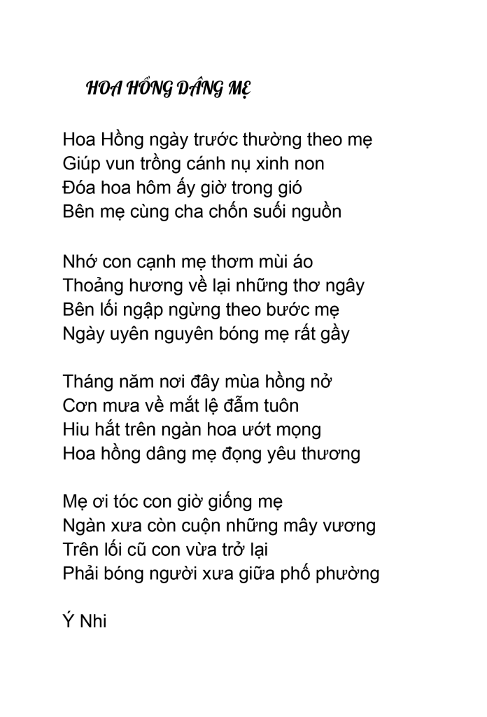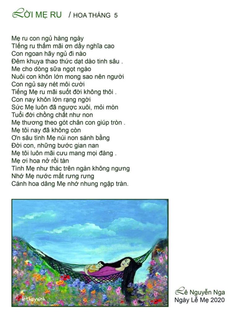 | Hôm Nay Ngày Lễ Mẹ Tôi muốn viết những vần thơ tặng Mẹ Gửi lên trời nhờ mây gió mang đi Mẹ ở trên cao ngàn thu cách biệt Ngày lễ Mẹ, giọt lệ ướt trên mi. Dâng lên Mẹ những vần thơ sầu muộn Cách biệt thiên thu, hoài niệm quay về Trên Thiên quốc nhìn về nơi trần thế Hồn ca dao vang vọng gió hương quê. Chiếc nôi êm ru con ngủ trưa hè Lời Mẹ ru giọt mật thấm trong mê Mẹ là dòng sông êm đềm xuôi bến Tắm ướt hồn con soi sáng đường về. Dòng sông ơi! Sóng vỗ về lưu luyến Nhớ về Mẹ hồn đau nhói lệ rơi Con ôm cả bó hồng dâng tặng Mẹ Thắp nén nhang buồn khói toả chơi vơi. Tế Luân Một bó hồng dâng tặng Mẹ Bài Thơ Viết Tặng Mẹ Tôi muốn viết bài thơ ngày lễ mẹ Gom hết loài hoa gửi đến tặng người Mẹ là hào quang rực rỡ bầu trời Thiêng liêng nhất là tình yêu của mẹ. Ngày mới chào đời ngây thơ khờ dại Chiếc nôi êm huyền thoại ngủ trong mơ Lời mẹ ru vần ca dao chấp cánh Hồn Việt Nam vang vọng đến bây giờ. Công ơn mẹ bao la như biển cả Đỉnh núi cao dòng suối chảy hiền hoà Mẹ là ngôi sao toả sáng chói loà Là đêm trăng tỏ, thơm ngát hương hoa. Con thương mẹ cả một đời tần tảo Mưa nắng trên vai gánh vác một đời Che chở cho con dòng đời vạn biến Mẹ là bà tiên lộng lậy tuyệt vời. Bước gian truân đời thăng trầm sóng gió Mẹ âm thầm chịu khó vượt chông gai Nuôi nấng con sớm tối không ngần ngại Nhìn con vui, mẹ tiếp bước đường dài. Dâng lên mẹ bài thơ thêm sầu muộn Mẹ không còn nhưng lòng mẹ quanh đây Trên Thiên Đàng con tin mẹ nhìn thấy Mẹ bây giờ chỉ là những bóng mây. Lê Tuấn Nhớ về mẹ |