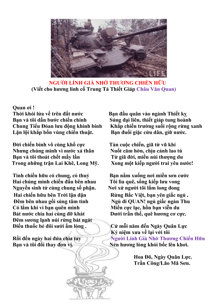 | Người Lính Việt Nam Cộng Hòa Tượng lính đâu rồi chốn nghĩa trang Lòng đau tưởng nhớ lá cờ vàng Ơi người chiến sĩ mồ sương phủ Hỡi kẻ anh hùng đất cỏ lan Lệ đẫm hương bay lồng nắng tắt Châu nhòa khói tỏa phả chiều tan Rừng sâu cải tạo buồn non nước Một thủa hy sinh phận chẳng màng Minh Thúy Thành Nội |