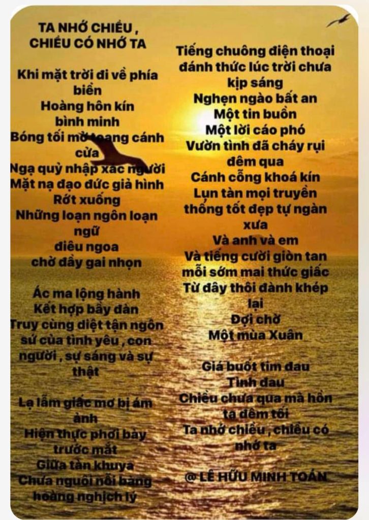 | Cảm Xúc Cõi trăm năm bỏ xứ lưu vong Bỏ quê hương bản sắc dòng sông Tưởng rằng chết nơi quê người lưu lạc Nào ngờ đâu tự tại thong dong. Quay đầu nhìn lại thấy quê hương Dòng mê tư tưởng thả trôi sông Tiếc người vẫn thế không thay đổi Chủ thuyết sai lầm cộng sản cuồng. Trí nhớ lục tìm nguồn hạnh phúc Vò đầu vỗ trán hỏi trăm năm Bao giờ thời thế này thay đổi Chủ thuyết điên cuồng phải diệt vong. Thôi thì không nói đành im lặng Được mất công thành cái nghiệp chung Đời lính trải qua vạn chiến sử Hoài mong thức tỉnh những anh hùng. Tế Luân 08-04-23 |