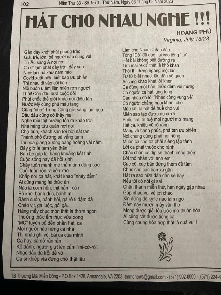 | NGÀY NAY Nhìn Mỹ nầy đây quá cỡ sang, Thức ăn đồ mặc vạn muôn hàng, Chất đầy siêu thị không sao kể, Sản xuất tràn đầy khắp thế gian. Thử bước vào chơi ngắm Costco, Rộng như sân bóng, hàng bày phô. Kệ cao, bàn thấp bày muôn thứ, Vạn khách Tây Tàu kéo mại dô. Chục chỗ thâu tiền thật quá nhanh, Xe mua hàng chứa đống to bành. Thu ngân bấm bấm qua như chớp, Thấy rõ bill ra, card chớp thanh. Tư bản nầy đây lắm phát minh, Bốn mươi năm trước muốn thông tin. Điện đi từng chữ hai đô một, Nay được ngồi nhà chuyển sách in. Nửa kỷ qua internet được phát ra, Thông tin sách vở chóng xuyên qua. Năm Châu kết mạng nhanh đàm thoại, Như chuyện trò nhau giữa một nhà. Đám Cộng ngu cuồng mãi bịp dân, Tối tăm dân trí, khổ muôn phần. May nhờ net phủ, trăm người biết, Thức tỉnh mau lên, chuyện thiết cần. Nhật Quang Phi Hồ (Aug 2023) |