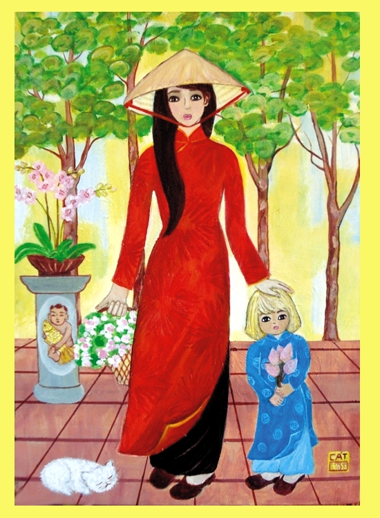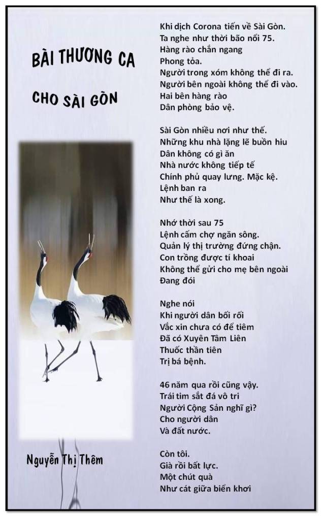 Tình Thơ Viết Vội![]() Thơ tình em lỡ gửi lên mây Mây bay cao quá biết sao đây Làm ơn, chim nhỏ tìm dùm chị Cái mỏ xinh xinh đem lại này. Chim bảo chị ơi! Thơ không chữ Người ấy đọc xong mang theo luôn Gió cuốn tình yêu chị bay mất Treo ở đầu sông chẳng thuyền buồm. Con sông cứ chảy gió vẫn bay Thơ tình chị viết thuở hai hai Gió lùa tà áo dài cô giáo Cuốn cả bài thơ viết thật dài. Người nhận thơ tình đi lính xa Chị ngồi trong lớp nhớ người ta Tóc chị nhuốm đầy màu phấn trắng Bạc phận hồng nhan lệ nhạt nhòa. Chị khóc, thơ tình lòe những nước Như tóc hôm nào đẫm giọt mưa Anh hôn lên má, lên mi ướt Giờ có còn ai hôn sớm trưa. Nắng đã vừa lên trời Cali Màu xuân lấp lánh ánh xuân thì Có con chim nhỏ mừng nắng ấm Đậu bên song cửa chẳng chịu đi. Chim hỏi chị ơi chàng về chưa Có đem trả chị bài thơ xưa Chị cười khẽ nói chàng đã mất Bài thơ treo giữa ánh trăng thưa. Mỗi tháng ngày rằm chị ăn chay Trăng treo đỉnh núi bài thơ này Xa quá chị không đọc lại được Chắp vá từng câu phận rủi may. Nguyễn thị Thêm |