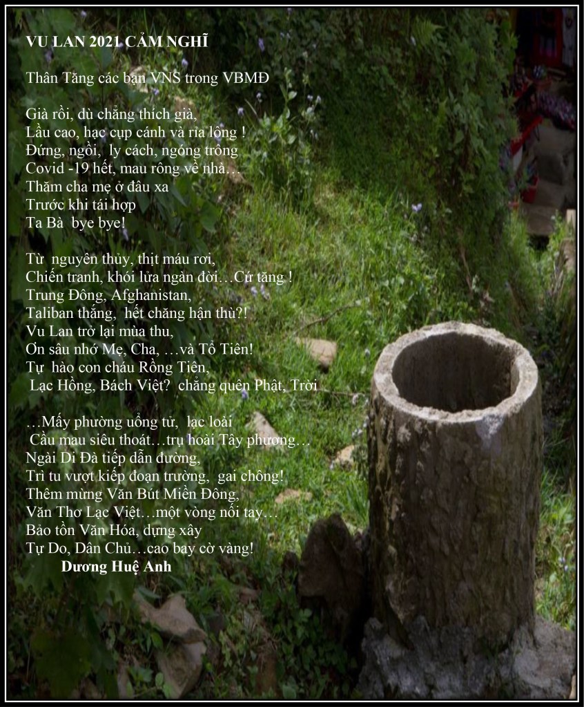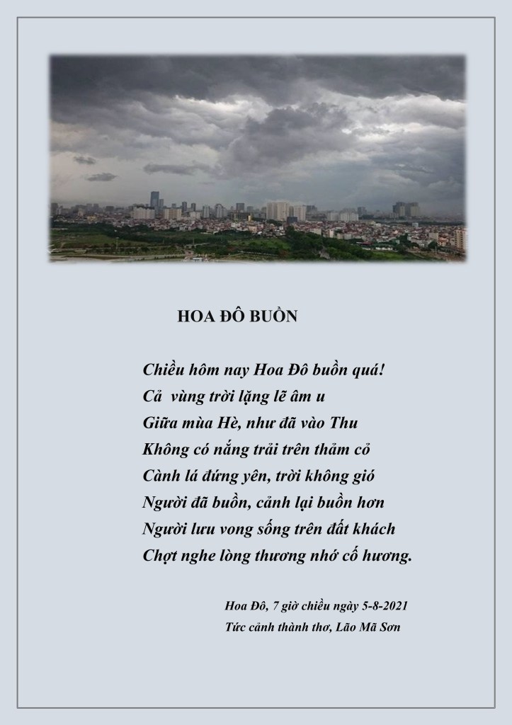 | GIỌT NẮNG QUÊ HƯƠNG Mùa hè ở Mỹ nắng chang chang Ngọn cỏ cành cây cũng héo vàng Xơ xác bên đàng hoa rũ cánh Chán chường đàn bướm chẳng bay sang Mùa hè lý tưởng chút nào đâu Nóng nực như điên nhức cả đầu Nóng nực bực mình hay nổi cáu Tại trời nào phải tại em đâu Anh về bên ấy cho em nhắn Em nhớ em thương giọt nắng vàng Trải giữa làng quê hương mộc mạc Ấm tình cô lữ ấm xuân sang Anh về bên ấy cho em gửi Ðôi cánh tay em với nụ cười Rực rỡ bên trời hồng sức sống Vòng tay ôm trọn bóng quê hương Anh về bên ấy cho em nhớ Những lũy tre xanh vạt lúa vàng Vi vút thông reo chiều gió lộng Nhớ mùa phượng vĩ lúc hè sang Anh về bên ấy nhớ dùm em Ðón gió quê hương với nắng vàng Ôm cả bầu trời trong ánh mắt Mang về đất khách tặng cho em nguyễn phan ngọc an – mùa hè California 2021 |
