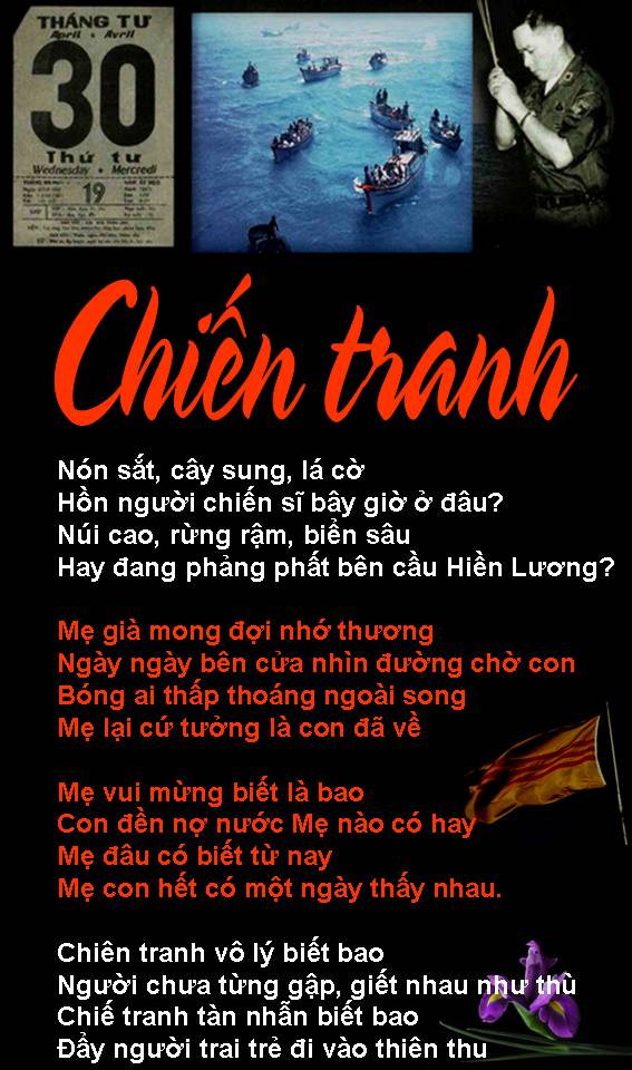 | BUỒN THÁNG TƯ 75 Tháng Tư chiến sự khắp kinh hoàng, Dân chúng Miền Nam lắm chết oan. Giặc Bắc tràn vào hăng bắn giết, Nam quân bối rối Tổng quy hàng. Chiếm xong đểu cáng tha hồ cướp, Xót cảnh lương dân chạy loạn tràn. Khốn khổ bao năm xương máu đổ, Rốt cùng nô thuộc lệnh Tàu ban. Đồ Quảng |