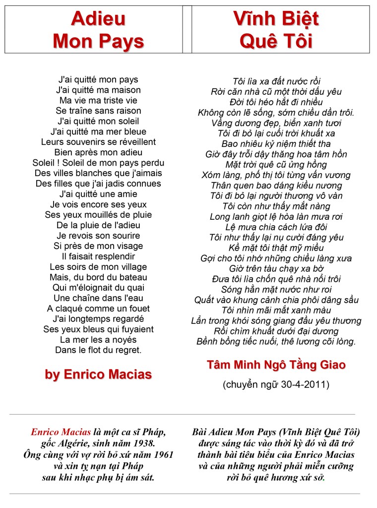 Tổ Quốc Trong Mơ Tháng Tư về đau thương Mùa Xuân xưa uất hận mãi còn vương Bao nhiêu năm dài rong ruổi tha phương Lòng nghe như oán hờn Nơi xứ người nhiều đêm Nhìn mưa rơi từng hạt nhớ quê hương Vận nước nổi trôi theo dấu thời gian Lòng chứa chan nỗi buồn Mong ngày về không xa Chung vai lần nữa gánh vác sơn hà Mộng ước dần theo mây khói nhạt nhòa Lòng xót xa tuổi già Từng người bạn ra đi Quên hết một thời nhân thế sầu bi Ly rượu giờ đây giọt đắng tràn mi Lòng đau, nói được gì Tổ quốc vào trong mơ Lá Cờ Vàng Ba Sọc Đỏ gió đưa Thành phố tươi vui, hương thơm lúa mùa Lòng hạnh phúc vô bờ Dương Việt-Chỉnh 14Apr2022 |