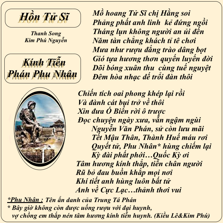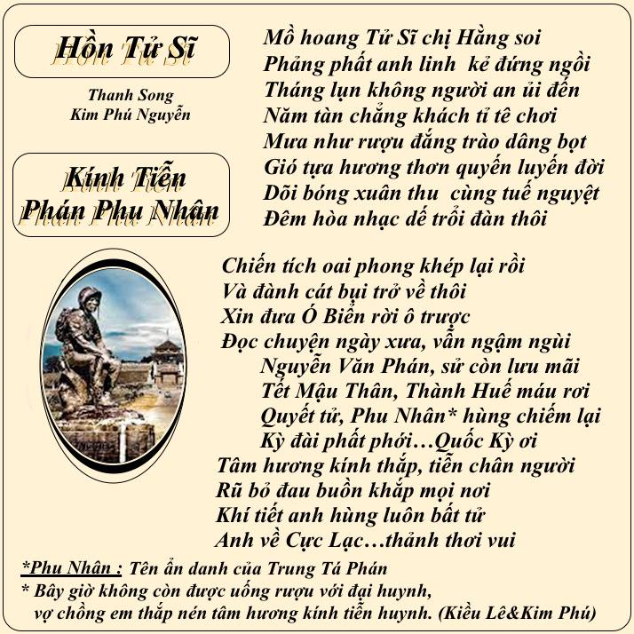 | TƯỞNG NHỚ NGŨ HỔ TƯỚNG (Ngũ Thủ) (3) Chuẩn Tướng LÊ VĂN HƯNG Ngũ Hổ Miền Tây phỉ dạ trai Chiến chinh ngang dọc quyết trui mài Hè gìn An Lộc bằng mưu giỏi Hạ giữ Bình Long bởi chước tài Bất khuất, thành vong lìa thế tục Kiên trung, quốc nạn đến tuyền đài Anh hùng tử, khí hùng không tử Vọng nén hương nguyền theo gió bay (4) Chuẩn Tướng TRẦN VĂN HAI Đuốc thiêng rực sáng vẹt mây mù Tướng giỏi tài ba lắm kế mưu Gìn giữ dân tình tâm chính trực Trui rèn binh lính dạ ôn nhu Xông pha giới tuyến truy lùng giặc Bảo vệ Thành Đô kiểm soát thù Nước mất thân còn, thêm tủi hận Quyên sinh, cái chết đẹp ngàn thu! Thanh Song Kim Phú |