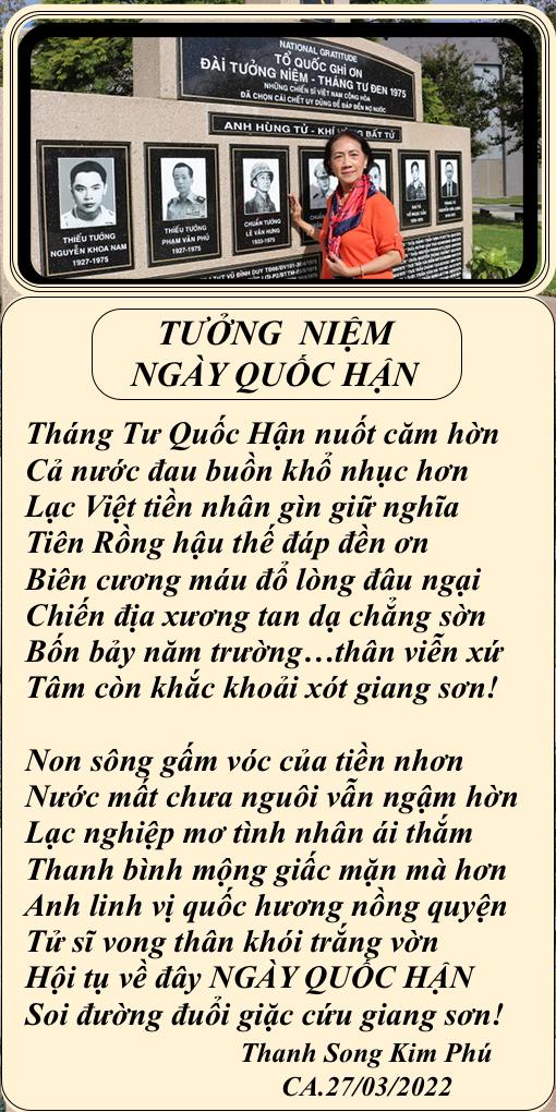 | (5) Chuẩn Tướng LÊ NGUYÊN VỸ Trên ban nhật lệnh…chiến tranh tàn! Cờ trắng căm hờn gió bạt ngang An Lộc ta gìn nơi hiểm yếu Lai Khê giặc ngại chốn gian nan Đành cam bỏ súng vì không đánh Phải chịu buông tay dẫu chẳng hàng Phát đạn riêng mình, trang dũng tướng Tâm hương phưởng phất, khói vờn nhan Thanh Song Kim Phú CA. Apr/05/2022 (Họa Vần Thơ NMT) Tưởng Nhớ Đại Tá HỒ NGỌC CẨN Thật xót xa trang sử nước nhà Xem hình ngưỡng phục giọt châu sa Gần dân giúp đỡ tình nhân đạo Quý lính thương yêu nghĩa hải hà Quyết tử, trung kiên dù thất quốc Hành hình, kiêu dũng dẫu ly gia Anh hùng đến chết không lùi bước Dạ thẳng lòng ngay, rõ chính tà Thanh Song Kim Phú CA. Apr/7/2022 (Họa Vần Thơ SP) Tưởng Nhớ Trung Tá NGUYỄN VĂN LONG Quê hương cám cảnh thật đau lòng Tự bắn vô đầu…chiến sĩ Long Tuyên bố quy hàng trên phải nhục Chấp hành tuẫn tiết dưới làm trong Thanh liêm chánh trực gìn sông núi Quả cảm trung kiên giữ giống dòng Cái chết hào hùng thêm ngưỡng phục Hồn thiêng…giúp nước diệt tà vong Thanh Song Kim Phú CA. Apr/7/2022 (Họa Vần Thơ BT) |