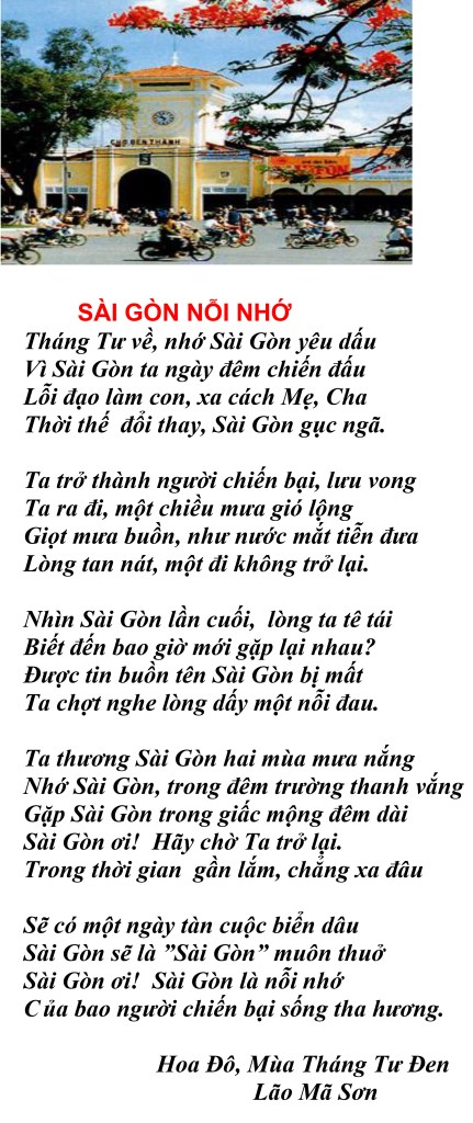 | SÀI GÒN, hòn ngọc Viễn Đông Sài Gòn hòn ngọc Viễn Đông Nay tên đổi lại thành tên Già Hồ. Kể từ Ba mươi Tháng Tư, Giật mình trong mộng còn như hôm nào! Nhà nhà bao nỗi thương đau , Vết thương còn nặng lệ sầu chưa vơi. Triệu người nhào đại ra khơi, Thân trao cá mập, thân nơi xứ người. Tan đàn xẻ nghé chao ơi, Đời như canh bạc … Tàu, Nga, chơi thiệt tình! ** Thành Hồ hay thành Cáo ? năm canh, Giật mình thức giấc lòng mình xót xa. * Hận Tháng Tư Đen vẫn chưa nhoà, Sài Gòn Hòn Ngọc …nay là Thành Cáo Già Hồ thế sao? THƯ KHANH *Tháng Tư Đen Sài gòn đổi tên . ** Thành Hồ ( Hồ, nghiã là con Cáo ! “ Cha Già Dân Tộc “ là con Cáo già ) |