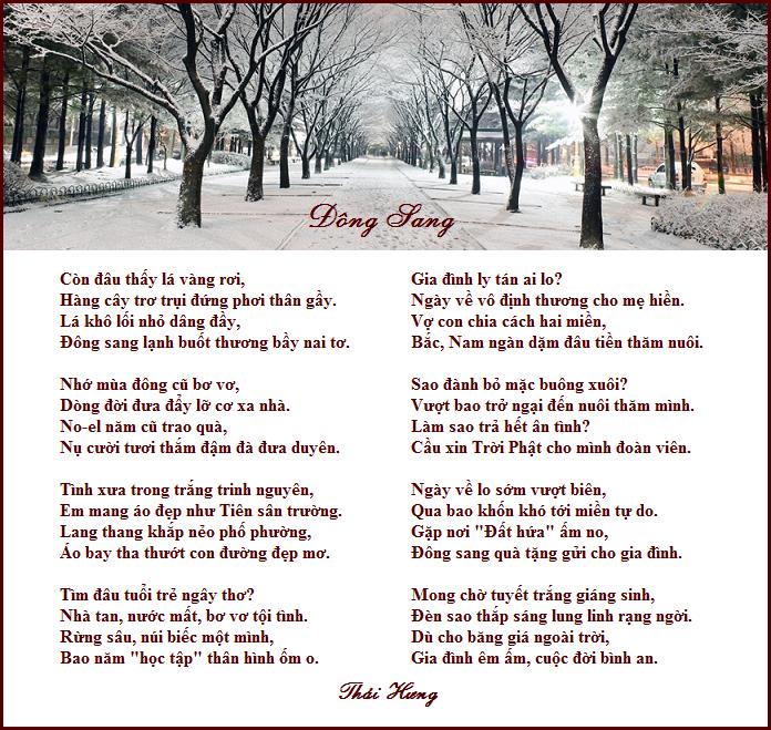 Bão Tuyết Trời ơi tuyết đổ tơi bời, Ngập đường, chắn lối cuộc đời mệt đây. Những ngày thơ thới như mây, Ha-wai rồi lại ngất ngây “Hoa Vàng”. Lệnh “Cô” nên phải vội vàng, Trở về xúc tuyết, nhẹ nhàng nghe chưa? Bao ngày hạn hán không mưa, Ca-li nắng cháy cỏ thưa hoa tàn. Trời cao sao nỡ phũ phàng, “Kẻ ăn không hết người sàng không ra?” Nơi thì tuyết đổ mưa sa, Phong, Hoa, Tuyết, Nguyệt người ta vui vầy. Còn nơi mong mỏi từng ngày, Hạt mưa tưới xuống đất cày khô khan. Cầu sao Trời, Phật hãy ban, Thuận hòa mưa nắng, bình an mọi người. Đầu Xuân vang dậy tiếng cười, Mừng nhau cạn chén cho đời nên hương. Dù cho xa cách muôn phương, Hãy luôn liên lạc, tình thương chan hòa. Thái Hưng |