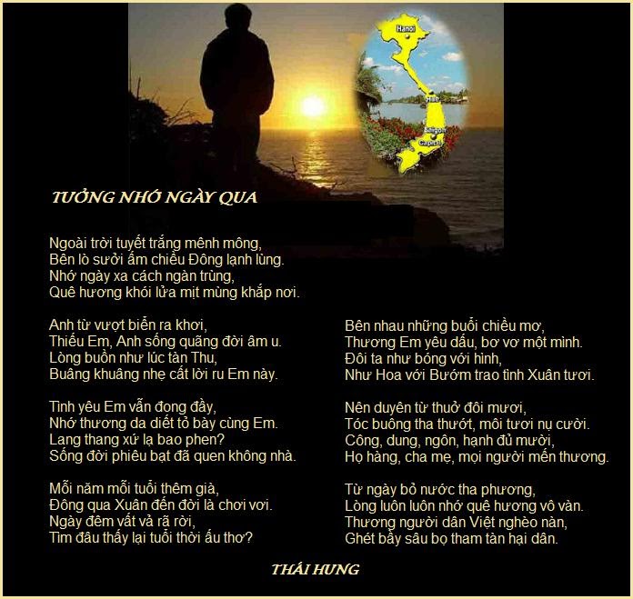 | Nhớ Thương Quê Nhà Mái đình giếng nước cây đa Sáo diều vi vút lòng Ta nhớ hoài Mỗi người số mệnh an bài Tha hương biết sẽ kéo dài bao lâu? Cõi đời bãi biển nương dâu Phiêu lưu khắp nẻo nơi đâu quê nhà Tạm xa cha mẹ ông bà Ngày ra đi vẫn tin là ngắn thôi Chia tay nước mắt mặn môi Mong ngày gặp lại mây trôi không ngừng ! Mong ngày đoàn tụ ăn mừng Nhớ lời hẹn ước chưa từng lãng quên Nhờ bao bạn hữu kề bên Nỗi buồn xa xứ trở nên nhạt nhoà! Nhưng tình quê vẫn đậm đà Thơ văn nhạc Việt món quà quê hương Dù cho lưu lạc mười phương Đón mùa thu đến vấn vương tuổi vàng! Nhớ màu lá đỏ cây Bàng Cốm Vòng Hồng Lạng trăng vàng bên nhau Thời gian thấm thoát qua mau Thu đi thu đến trước sau đợi chờ Dù cho cách trở đôi bờ Tình xưa quê cũ chẳng mờ nhạt phai Thái Hưng/PGH |