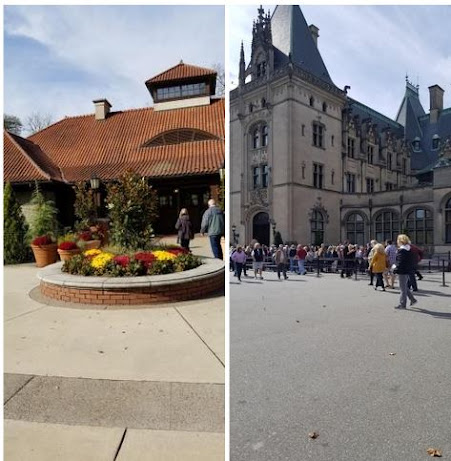 Lâu đài cách khách sạn khoảng 25-30 phút lái xe. Khi đến địa phận Biltmore có cổng to như cổng chào và bồn hoa xinh đẹp hiện nay phần lớn là hoa cúc đủ màu. Đến nhà bán vé rộng rãi lại sắp hàng có lẻ đến 30 phút mới đến lượt mình dù chúng tôi đến sớm khoảng 9g00. Phía sau chúng tôi cái đuôi sắp hàng rồng rắn dài ngoằn.Trong lúc con sắp hàng mua vé, tôi vào phòng chiếu phim gần bên xem họ giới thiệu Biltmore Estate từ thời chủ nhân là ông George Vanderbilt. Lúc ấy Biltmore Estate có hơn 20.000 mẫu đất nhưng con cháu bán bớt, nay còn 8.000 mẫu mà thôi.