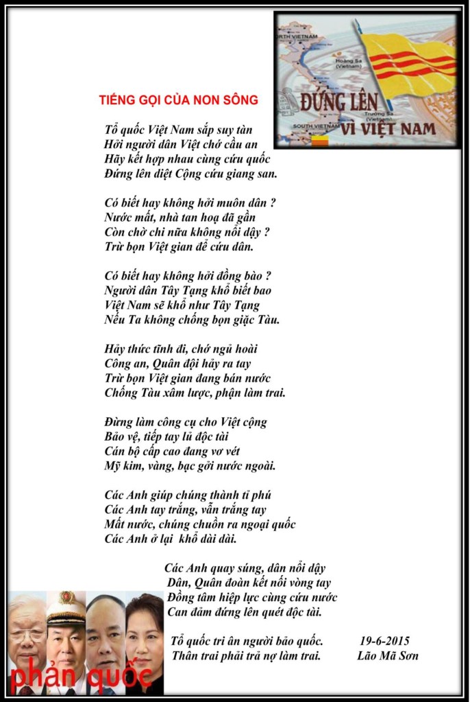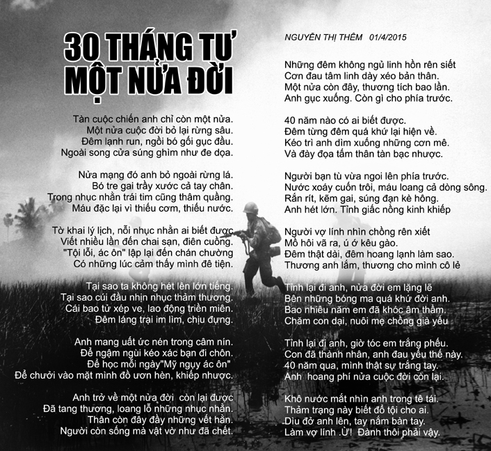 | Tâm thư người lính trận Một mai bỏ mạng sa trường Hòm , xin đóng kín lên đường về quê Huy chương cài ngực phủ phê Mẹ ơi, việc tốt, lời thề đã xong Cha ơi, xin chớ đau lòng Từ nay cha khỏi đèo bồng con hư Em ơi, học tập thật cừ Xe anh, em giữ , từ giờ thuộc em Chị ơi , xin chớ ưu phiền Em chị, chiều xuống triền miên giấc nồng Tổ quốc ơi, chớ vấn vương Thân tôi, lính chiến tử thương lẽ thường … Vô danh – Sao Khuê chuyển dịch |
