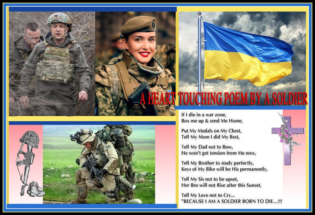 | Bài Thơ Xúc Động Từ Con Tim Người Lính Nếu tôi gục chết nơi vùng chiến sự Xác thân tôi đóng gói gửi về nhà Tấm huy chương cài lên ngực áo trận Nhắn lời Mẹ, tôi đã chết oai hùng. Nói với Cha tôi xin đừng cúi đầu Không lo lắng, vì tôi không về nữa Nói với em tôi học hành thật giỏi Chiếc xe đạp, sẽ thuộc về em tôi. Nhắn em gái tôi, xin đừng buồn tủi Tôi sẽ không về, sau bóng hoàng hôn Hãy nói người yêu của tôi, đừng khóc Vị Quốc Vong Thân. Cái chết Anh Hùng. Lê Tuấn Phỏng dịch theo ý bài thơ. Của người lính Ukraine. A Heart Touching Poem By A Soldier. If I die in war zone Box me up & And sent me home Put my Medals on my chest Tell my Mom I did my best Tell my Dad not to Bow He won’t get tension from me now Tell my brother to study perfectly Keys of my bike will be his permanently Tell my sis not to be upset Her bro will not rise after this sunset Tell my Love not to cry Because I am a soldier born to die .. !!! Ukraine Soldier |