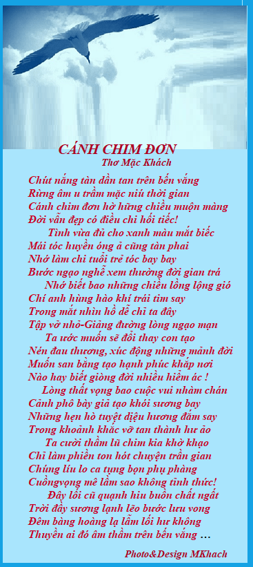 | CỘI NGUỒN Em lớn lên Hoa Kỳ xứ Mỹ Sống vui tươi chẳng chút u phiền Có bao giờ nghĩ đến niềm riêng? Mầm sống ấy từ người Tỵ nạn Khi đã lớn xin đừng ngạo mạn Đừng quên Em cội rễ từ đâu Muốn quên Em vẫn mãi da màu Thân phận đó làm sao biến đổi! Đừng bảo tôi Em rành Mỹ ngữ Đã ăn toàn đồ Mỹ cao sang Em nghe không trần thế gian nan Em sẽ hiểu màu Da vốn có! Em có biết Quê hương khốn khó Nhưng lòng người chan chứa ân tình Biết bao người nằm xuống hy sinh Em mới có ngày nay triển vọng Hãy đứng lên thanh niên viết sử Mang niềm tin chuyển đến Quê hương Xiết tay nhau vùi lấp hung tàn Cuộc sống mới Quê hương đón đợi MẶC KHÁCH |