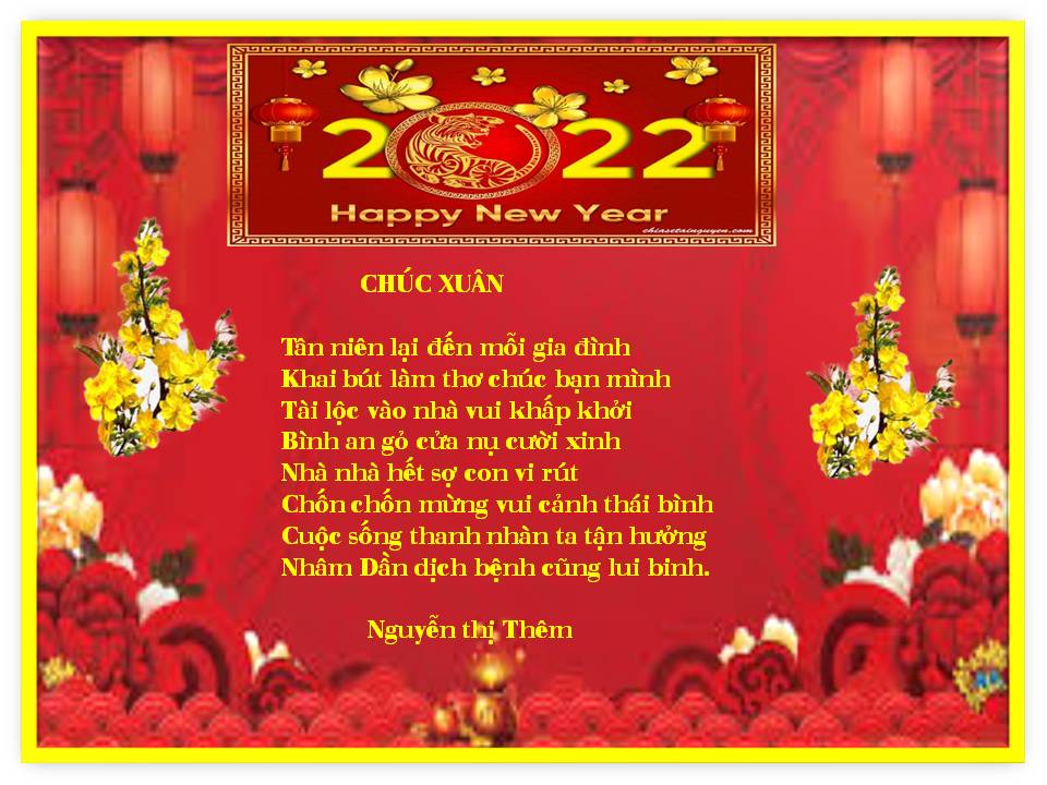 | CHÀO MỪNG NĂM 2022 NĂM MỚI đón chào nhã nhạc ngân Quên phiền hết khổ chuyện trầm luân Tay vung bầu rượu quên ngày tháng Ý bỡn nàng thơ rộn suốt tuần Hoa lá thắm tươi xua cát bụi Gió mây ngời đẹp tẩy phong trần Tân niên kính bút mừng bằng hữu Chúc phúc cho nhau mượn mấy vần Phương Hoa – TẾT TÂY 2022 |