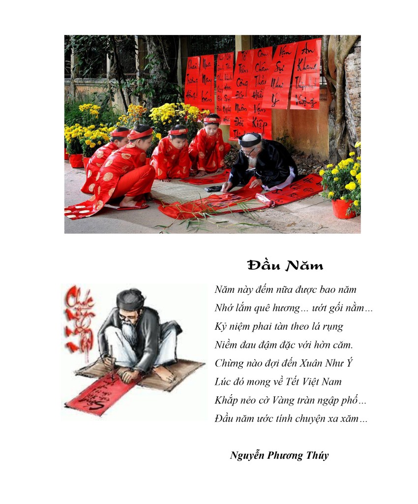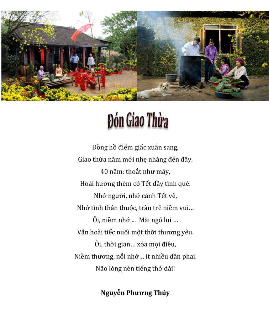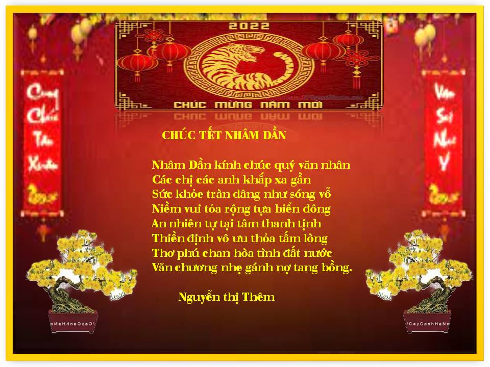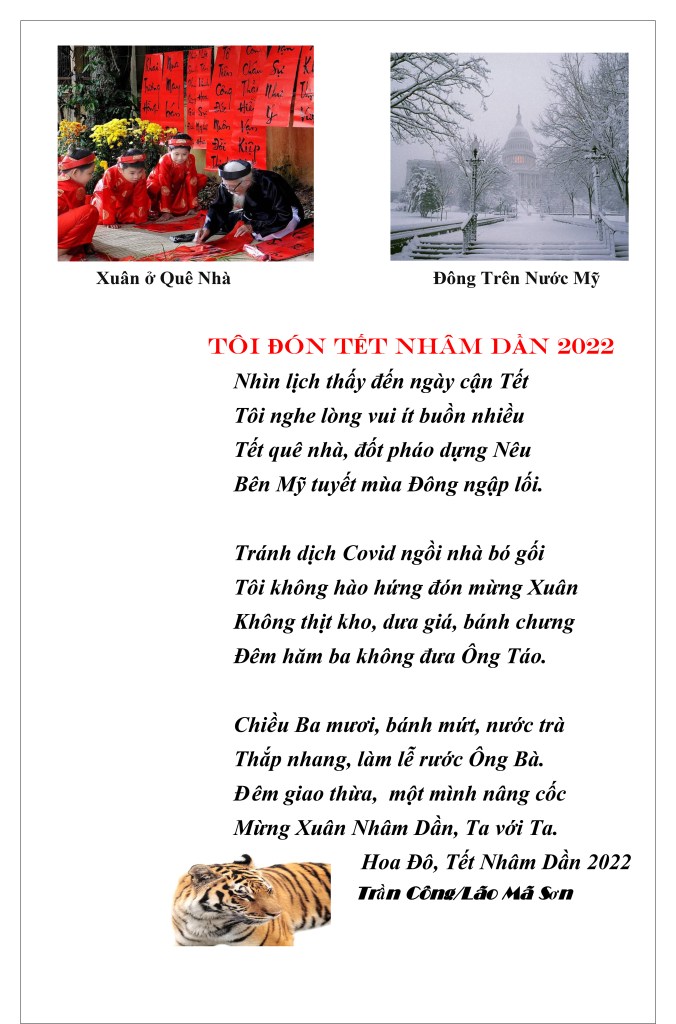 | NĂM MỚI ĐÓN CỌP VỀ Năm mới năm me Cọp sắp về. Người người sung mãn- sẽ tràn trề . Gia đình con cháu luôn hai jobs. Tiền tài rủng rỉnh với nhà xe. Toàn dân hết nạn con Covid. Hạnh Phúc tràn lan khắp tứ bề. Nhớ nhé bà con vui đón Cọp . Ăn mừng cái Tết Lunar Year. THƯ KHANH – Seattle – 1/2/ 2022 Sửa Soạn Đón Năm NHÂM DẦN – – – – – – – – – – – – – – – ĐÓN TẾT CỌP Mặt Trời chở nắng đi đâu , Chắc mai Ông đến thăm lầu thơ tôi ?! Nhà tôi ở cuối chân đồi Tết này xum họp mọi người cùng vui . Cọp về, Ta mạnh hơn thôi , Mạnh như là Cọp xây đời ấm no . Tuyết tan khỏi phải nằm co, Ra ngoài thưởng thức như là ở Quê . Bánh chưng xanh, kẹo mứt tràn trề , Dưa hành củ kiệu, giò bì, thịt ninh . Ui chao cỗ sắp linh đình, Việt Nam đón Tết Cọp …- cứ như mình ở Quê. Mỹ đây! Chẳng thiếu thứ gì , Sài Gòn ở giữa nơi Quê… America Chúc đồng Hương nhé : nhà nhà, Cùng nâng ly rượu cho vừa lòng nhau. Hát bài Tết , Tết tiễn Trâu Đầu năm vui vẻ, Covid đâu dám lan tràn. THƯ KHANH |