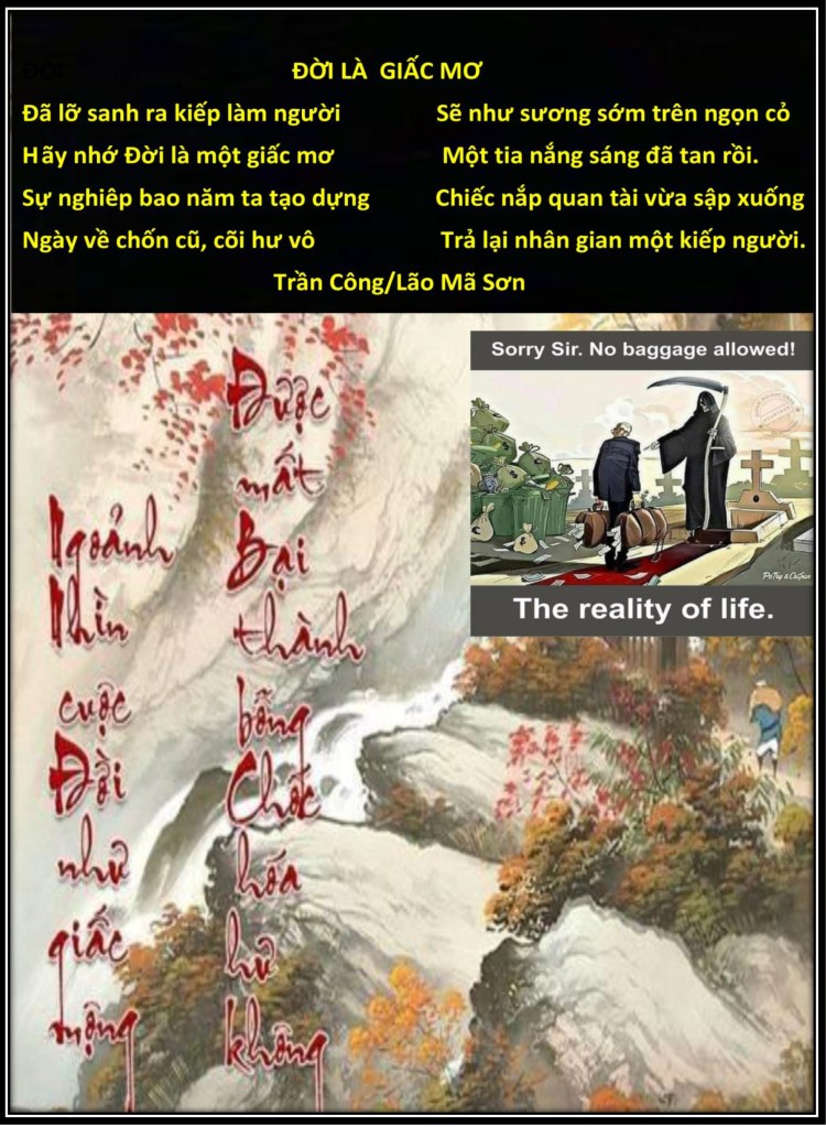 | Đoàn người di tản Giống như chiến tranh. Gồng gánh gia đình Thương tâm chi xiết. Đường xa mỏi mệt. Cha con, vợ chồng Chiếc xe cà tàng Bao giờ cho tới. ![]() Trên đường rong ruổi Những người có lòng Đem cho thức ăn Ít tiền lộ phí. ![]() Những điều phi lý Những chuyện đau lòng Nếu kể dài dòng. Cả ngày chưa hết ![]() Ngọc Hoàng có biết Trần gian tội tình Dân chúng điêu linh Chết vô số kể. Ngọc hoàng ngấn lệ. Thôi thế đủ rồi. Việt Nam được lui Táo Cali báo cáo. Thần xin trình tấu. Nước Mỹ năm nay Lắm chuyện trái tai Cười ra nước mắt Dịch bệnh đứng nhất Chích ngừa đi đầu Mà không tới đâu Số người không tin Nhất định không chích ![]() Mới vừa bớt dịch Biến thể Omicron Lây lan vòng tròn Tràn lan cả nước. ![]() Cali sau trước Giữ vững lập trường Khi ra ngoài đường Khẩu trang bắt buộc Kinh tế thì tuột Trôm cướp gia tăng Nhảy vọt giá xăng ![]() Vật tư càng mắc Cái ăn cái mặc Có chính phủ lo Nhiều người nằm co Chờ tiền thất nghiệp Thống đốc hên thiệt Xém bị rớt đài Bây giờ rất oai Cứu nguy Dân Chủ ![]() Phong ba bão lũ Dân Việt quen rồi Nên cũng nhờ trời Mọi người no đủ. Làm ăn lam lũ Con cháu thành công Quyết chí đồng lòng Tránh xa Covid Được rồi ta biết Các Táo về trần Lo cho người dân Năm nay Nhâm Dần Cọp vượt khó khăn Kinh tế, giảm dịch. Còn những bi kịch Chuyện của thế gian Do bởi tham-gian Ái -dục- ngu muội Ta sẽ xem lại Các Táo đừng lo Mau nộp ráp bo Lãnh lương… Tạm Biệt. Ngọc Hoàng nói nhỏ Các Táo về trần Những thần đứng gần Quarantine 10 bữa. Đóng cửa . Thùng …thùng… thùng Hôm nay 23 tháng chạp , theo tục lệ là ngày đưa ông Táo về trời. Tôi xin viết một bài sớ vui, lấy hình trên google vui vui để gửi đến các bạn. Trước thềm năm mới kính chúc mọi người vui vẻ, sức khỏe, an lành. Nguyễn thị Thêm 25/01/2022 |