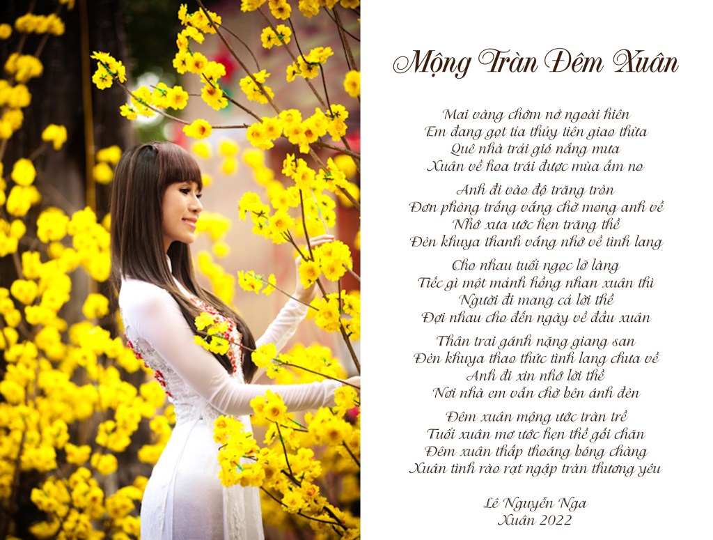 | MỘNG ÐÊM XUÂN Ðông hãy qua nhanh cho chồi xanh trổi dậy Ðón nàng xuân má thắm môi xinh Dáng liễu đài phương phi cốt cách Tơ hong dài giấc mộng nguyên trinh Nàng đã bước vào tim tôi rất nhẹ Ðêm cô liêu bỗng sáng rực hoa đăng Lời ru êm dìu tôi vào cõi mộng Ðường thiên thai hoa gấm dệt tơ giăng Hãy ngồi bên tôi hỡi nàng tiên áo trắng Ðôi mắt huyền như bảo ngọc kim chi Dù kẻ tục người tiên tôi vẫn muốn Ðến bạc đầu đừng nói chuyện phân ly ! Thiếu vắng nàng xuân đời chẳng nghĩa gì Ðâu chim hót, đâu hoa hồng hé nở Ðâu muôn sắc, đâu rượu đào, pháo nổ Tay trong tay dìu dặt dưới trăng mơ Ðể tao nhân dệt nốt những vần thơ Ôm giấc mộng liêu trai vừa trở dậy Hoa tình yêu trăm miền đang mở ngỏ Nàng xuân ơi … tao ngộ phút này đây Ðại dương kia sóng nước vẫn vơi đầy Duyên tái tạo kiếp này ta hạnh ngộ Chốn trầm luân ta đã nhiều khốn khổ Ðến đây em …cho tình thắm bờ môi … nguyễn phan ngọc an – xuân Nhâm Dần 2022 |
