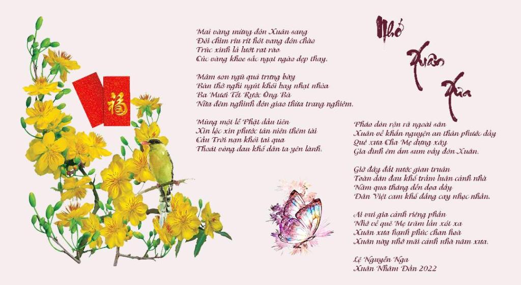 | MAI XUÂN VỀ. Anh có thấy hương vị tết đâu đây Dù ngoài kia đất trời mùa Đông lạnh Ngày tháng cuối năm ghi trong tờ lịch Xuân đang về với trăm nhớ ngàn thương. Mai xuân về đỏ rực hoa Trạng Nguyên Hoa Cúc vàng của mùa Thu ở lại Hoa Vạn Thọ chờ ai mà tươi mãi Forsythia em ngỡ cánh Mai xưa. Tết của em chưa bao giờ đi xa Bao năm rồi mà bâng khuâng vẫn thế Những mùa xuân không làm nên dâu bể Cuộc đời làm dâu bể những mùa xuân. Mai xuân về đi chợ tết cùng em Tìm giây phút ngóng chờ nôn nao cũ Mùi hành kiệu ngon từ trong tay mẹ Bánh chưng xanh cha gói lá dong thơm. Mai xuân về anh có chúc gì không Ly rượu ngọt cùng em mừng năm mới Tình của anh là hương hoa thơm thảo Em để dành thương quá phút giao duyên. Cánh thiệp đầu xuân em viết cho anh Cho người quen, cho người chưa hạnh ngộ Mùa xuân đẹp ai cũng là thi sĩ Gởi trao nhau những lời chúc câu thơ. Ở nơi này em nhớ Tết nơi kia Những cái tết của một thời quá khứ Mai xuân về đón giao thừa anh nhé Đón vào lòng thương quá một trời quê. Nguyễn Thị Thanh Dương ( Nov.17, 2021) |