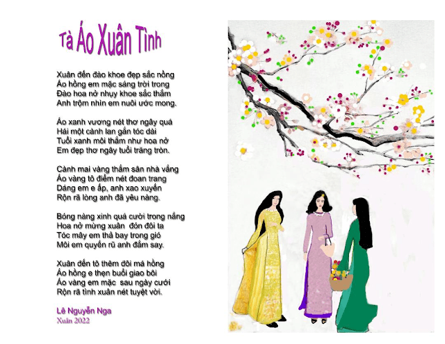 ![]() Thuyền Hoa Xuân Thuyền có chở em về thăm bến cũ Xin hãy cho tôi rực sáng đêm trăng Hãy nói lời yêu ngọt ngào say đắm Khoảng trống hồn tôi bóng tối vắng tanh. Thuyền có chở mùa xuân hoa đào nở Cánh mai vàng rơi rụng dưới bước chân Vòng tay ôm choàng vai bao nỗi nhớ Những nụ tầm xuân rực rỡ muôn phần. Tôi thả hồn tôi mùa xuân vừa đến Đôi cánh nhẹ bay lặng lẽ hư vô Em đón hồn tôi nụ hôn thần thánh Dưới bóng trăng, tình nổi sóng nhấp nhô. Hẹn mai nhé em về thăm phố cũ Ánh trăng rằm soi sáng lối em xưa Hai bóng bên nhau nhảy điệu luân vũ Tiếng nhạc xuân tình đẫm ướt như mưa Lê Tuấn Xuân trên Thung lũng hoa vàng January 20, 22 ![]() Thiếu Nữ Vui Xuân Thiếu nữ du xuân áo lụa vàng Khoe tà áo mỏng nắng xuyên ngang Vu vơ ngọn gió đùa ve vuốt E thẹn sao tình bỗng chứa chan. Thiếu nữ đôi mươi má ửng hồng Đôi tà yếm thắm lắm người trông Môi hồng mắt biếc như tiên nữ Ngọn gió xuân tình đầy ước mong. Lê Tuấn Tường Hoa Muôn hoa nở trước bức tường hoa Những hạt sương mai sáng chói lòa Trăm đóa hồng, đào, mai tứ quý Ngày xuân khoe sắc dáng kiêu sa. Vườn xuân hé nụ khối tình đầy Cánh én nghiêng mình xoải cánh bay Nét đẹp xuân thì như khởi sắc Tình riêng một bó hồng trên tay. Lê Tuấn ![]() Vui Xuân Cô gái vui xuân buổi nắng vàng Lụa hồng phất phới đoá hoàng lan Thoáng đâu cơn gió tung tà áo Chút hở hang nhìn bỗng ngỡ ngàng. Ghẹo bướm đùa hoa lòng luyến tiếc Xuân tình chớm nở cánh hoa mai Một thời ong bướm lẳng lơ đến Cô gái du xuân đỏ gót hài. Lê Tuấn |