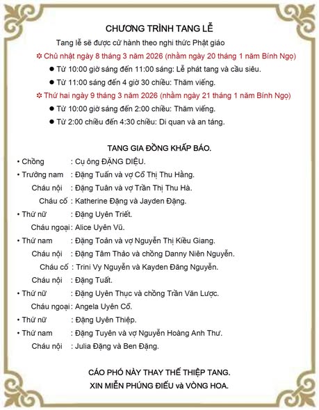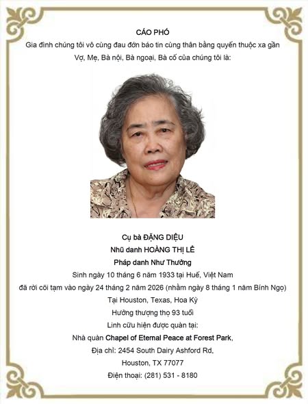 | Maryland 2/4/2026 Kính thăm quý văn hữu VBVNHN, Cung Lan rất buồn khi biết tin hiền mẫu của văn hữu Đặng Toản là cụ bà Đặng Diệu, nhũ danh Hoàng Thị Lê, pháp danh Như Thường qua đời ngày 24 tháng 2 năm 2026 tại Houston,Texas, Hoa Kỳ tạ thế ngày 24 tháng 2 năm 2026. Vì vội vã lo nhiều vấn đề trước khi lên đường nên Cung Lan không thể nào thông báo cùng quý văn hữu VBVNHN và gửi thiệp chia buồn cùng thi sĩ Đặng Toản và tang quyến. Hôm nay vừa về đến nhà, Cung Lan vội đăng tin này vào trang tin buồn để toàn thế hội viên cùng biết tin. Cung Lan xin chia sẻ những giòng thơ đượm đầy tấm lòng hiếu thảo của người con mất mẹ và xin thành kính phân ưu cùng thi sĩ Đặng Toản và tang quyến. Tiễn má Năm Bính Ngọ, tháng giêng mùng tám Trời Houston chưa rám vầng dương Má theo mây trắng ngàn phương Con ngồi dưới cội vô thường gió rung Đau đớn ngỡ chạm vùng ảo ảnh Cầm đôi tay má lạnh , im lìm Da tay bầm nát mũi kim Pacemaker cạnh buồng tim ngưng rồi Đời má khổ , mồ côi ngoại sớm Phận ly hương bước dợm bôn ba Sống cùng con cháu thuận hòa Nuôi chồng tù tội mười ba năm tròn Kinh tế mới, bầy con sáu đứa Cả Tú tài, út lứa lớp ba Chuồng heo, nương rẫy nguy nga Năm đôi ba bận, chồng xa nuôi bền … Trần gian đã chẳng đền cuộc hẹn Thương bầy con má lén mà đi Mới hay đời bất tư nghì Bao nhiêu huyền lực, gia trì ban ơn Tuổi cửu thập thường cơn táo bón Đơn thuốc dùng thêm ngọn rau lang Cuối tuần ngày rộng thênh thang Ra vườn con ngắt rau lang đem về Đổ ra lặt , tỉ tê má nói Cái thằng con sao giỏi tăng gia Khi trái mướp, lúc bí, cà Húng thơm, bồ ngót một nhà xanh rau Dẫu sống giữa thị thành huyên náo Trong vườn rau đủ nấu tập tàng Bây giờ ngắt đọt rau lang Không ngờ con quấn khăn tang trắng đầu Thời gian đã ghìm sâu độ lướt Đẩy walker má bước liêu xiêu Cầm tay má một bên chiều Con chưa lường hết bao điều của đêm ( giường queen má ngủ rất êm Con bồi dòng lệ cho thêm mặn mòi) Giờ có lúc những khi bụng đói Không còn nơi lục lọi bữa cơm Con như ngựa chiến thâu bờm Cúi đầu gặm nắm rạ rơm nỗi niềm Giờ tử biệt, phương trình vô nghiệm Cõi lòng con buồn chiếm đầy sân Má ơi vốc đất ân cần Bầy con vun nấm , mộ phần má thơm Houston ngày 25/2/2026 Đặng Toản Không biết nói sao để làm nguôi nỗi đau mất mẹ, Cung Lan chỉ mong văn hữu thi sĩ Đặng Toản tin rằng bác gái Đặng Diệu rất tự hào có người con trai đa tài, hiếu thảo và luôn khiêm cung, nhẫn nhục, chăm làm như văn hữu. ![]() Kính mong quý văn hữu VBVNHN góp thêm lời chia buồn để gia đình văn h ữu thi sĩ Đặng Toản thấu rõ sự quan tâm và quý mến của chúng ta & hiệp lời cầu nguyện hương linh bác Đặng Diệu pháp danh Như Thường sớm an nhiên nơi miền Cực Lạc Kính mến, Cung Thị Lan |