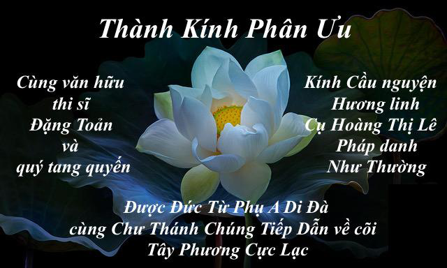 | Thành thật chia buồn với VTS Đặng Toản cùng gia đình và tang quyền. Nguyện cầu vong linh Cụ Bà Hoàng Thị Lệ, pháp danh Như Thường sớm được Vãng Sanh Tịnh Độ. GĐ Tha Nhân Đồng Thành Kính Phân Ưu… R.I. P |