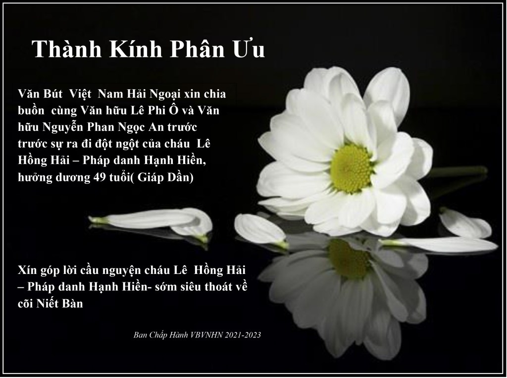 | Được tin buồn cháu LÊ HỒNG HẢI con trai của Văn Thi Sĩ NGỌC AN vừa qua đời tại VIỆT NAM. Ban Chấp Hành cùng Toàn thể Hội Viên VĂN BÚT VN HẢI NGOẠI VÙNG ĐÔNG BẮC HOA KỲ Xin chân thành chia buồn cùng NGỌC AN và toàn thể Tang quyến. Cầu xin Hương linh LÊ HỒNG HẢI Pháp Danh HẠNH HIỀN được sớm về cõi Vĩnh Hằng. Thành kính phân ưu. BAN CHẤP HÀNH và TOÀN THỂ HỘI VIÊN VBVNHNVDBHK |