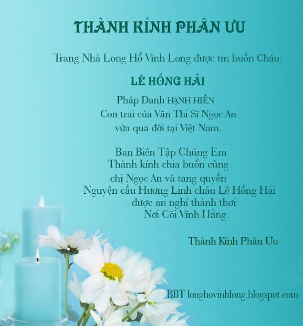 Xin Chân Thành Kính Phân Ưu Cùng VTS NGUYỄN PHAN NGỌC AN & Tang QuyếnXin Chân Thành Kính Cầu Nguyện Anh Linh Cháu LÊ HỒNG HẢI Pháp Danh HẠNH HIỀN Sớm Được Siêu Thoát Về Miền Tây Phương Cực Lạc Xin VTS NGUYỄN PHAN NGỌC AN Cố Gắng Gượng Nén Đau Thương Giữ Gìn Sức Khỏe Vì Chắc Hẳn Trên Cõi Vĩnh Hằng Vô Ưu Cháu LÊ HỒNG HẢI Nhất Định Không Hề Muốn Nhìn Thấy Mẹ Mình Quá Bi Lụy Tiều Tụy đâu LuânTâm |