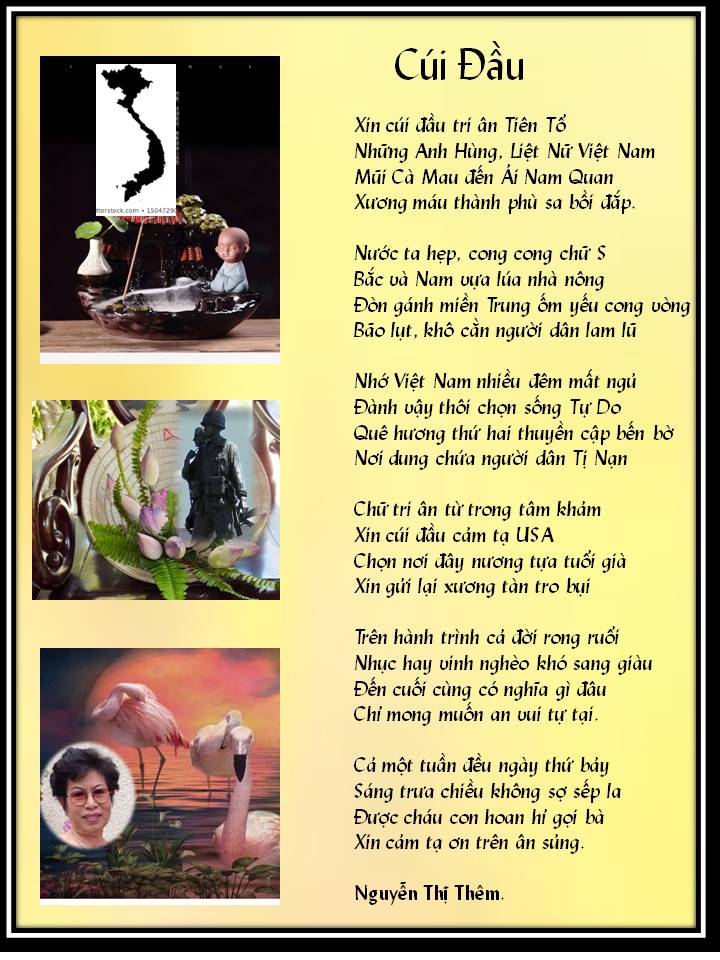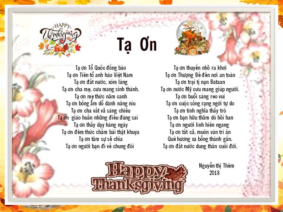 | Tạ ơn Tổ Quốc đồng bào Tạ ơn Tiên tổ anh hào Việt Nam Tạ ơn đất nước, xóm làng Tạ ơn cha mẹ, cưu mang sinh thành. Tạ ơn mẹ thức năm canh Tạ ơn bồng ẵm dỗ dành nâng niu Tạ ơn cha vất vả sáng chiều Tạ ơn giáo huấn những điều đúng sai Tạ ơn thầy dạy hàng ngày Tạ ơn đêm thức chấm bài thật khuya Tạ ơn tâm sự sẻ chia Tạ ơn người bạn đi về chung đôi Tạ ơn thuyền nhỏ ra khơi Tạ ơn Thượng Đế đến nơi an toàn Tạ ơn trại tị nạn Bataan Tạ ơn nước Mỹ cưu mang giúp người. Tạ ơn buổi sáng reo vui Tạ ơn cuộc sống rạng ngời tự do Tạ ơn tình nghĩa thầy trò Tạ ơn bạn hữu thăm dò hỏi han Tạ ơn người lính hiên ngang Tạ ơn tất cả, muôn vàn tri ân Quê hương xa bỗng thành gần. Tạ ơn đất nước dung thân cuối đời. Nguyễn Thị Thêm. |