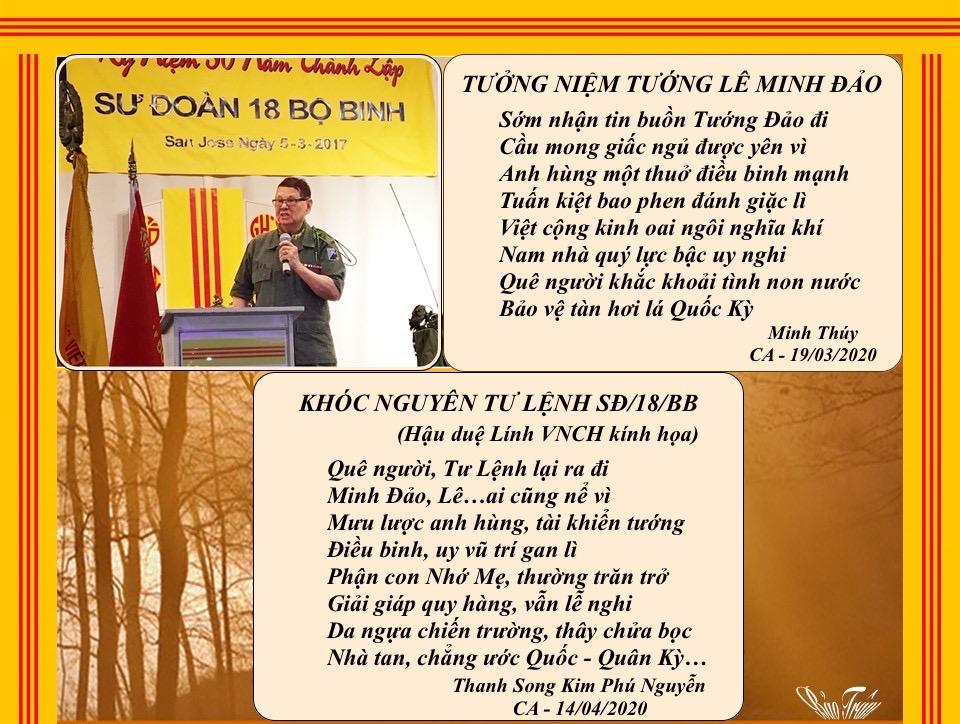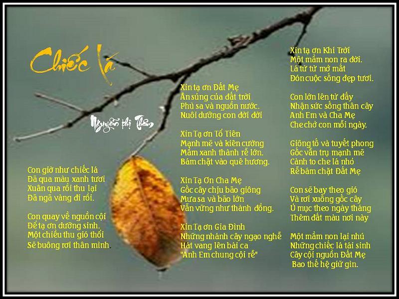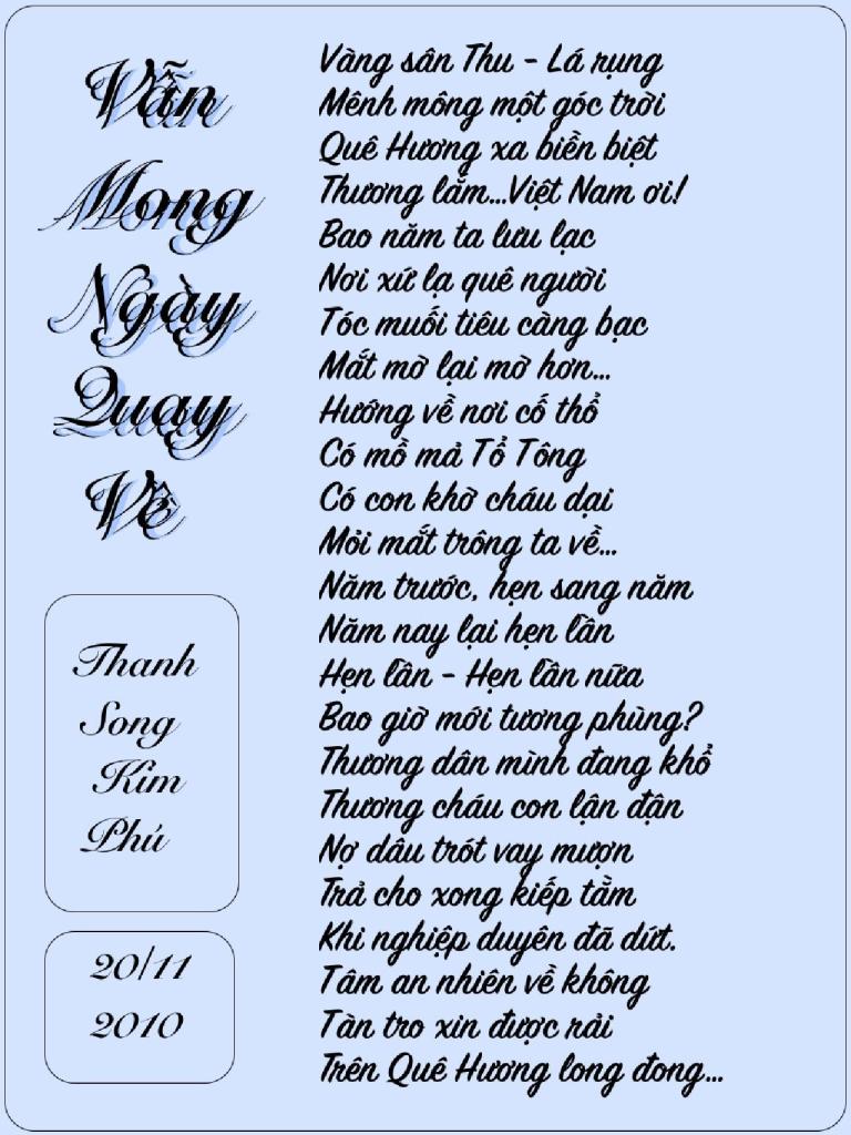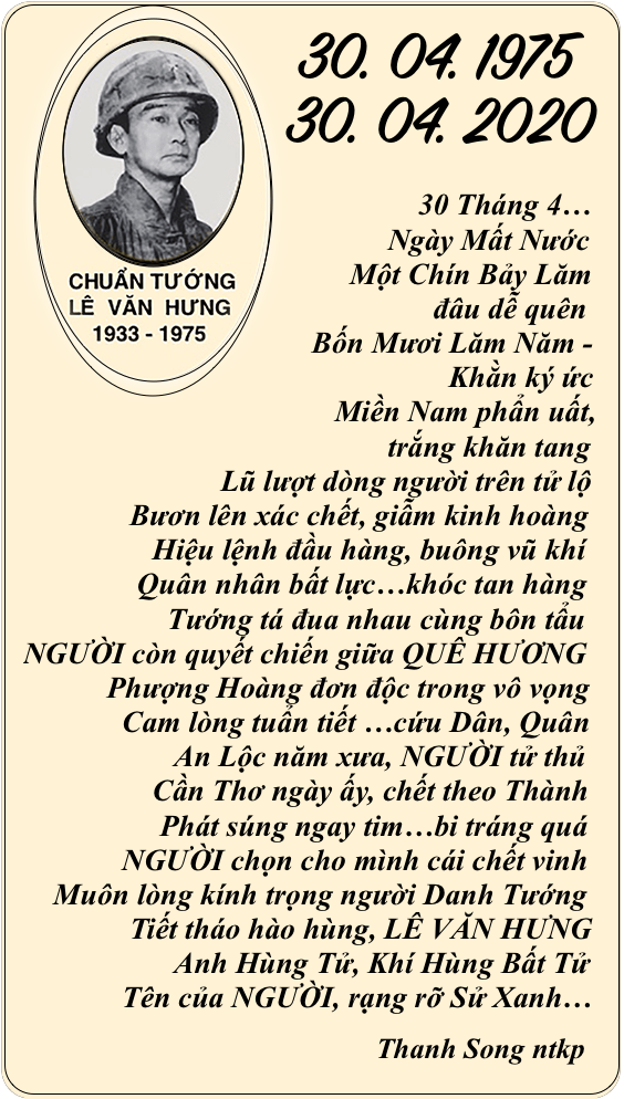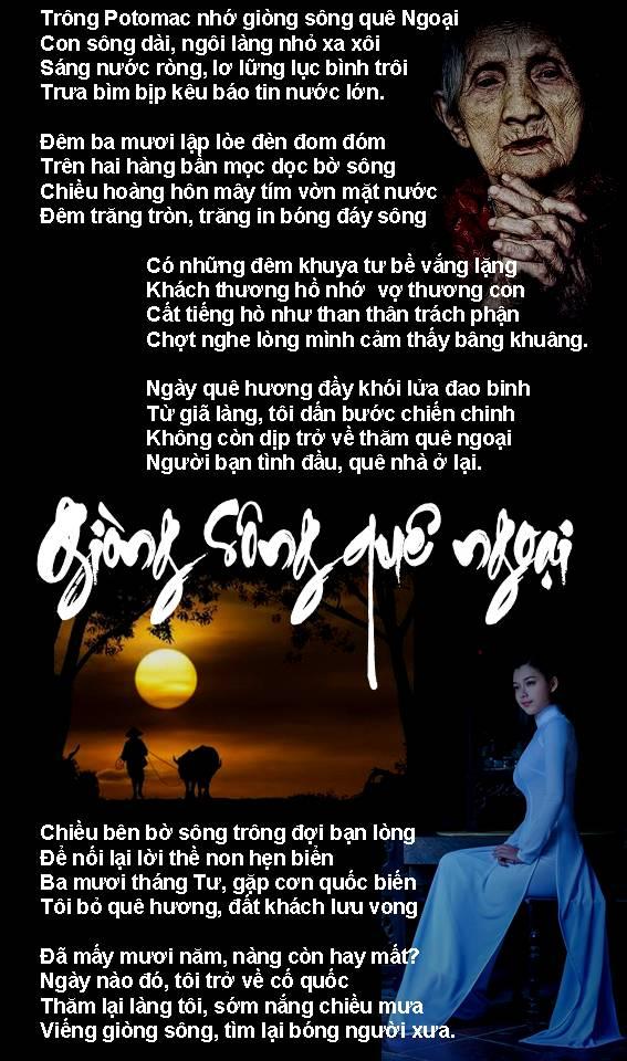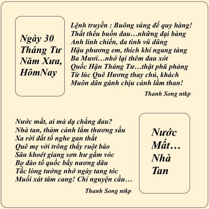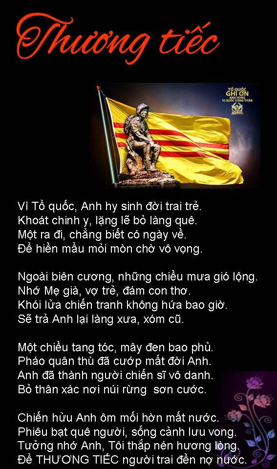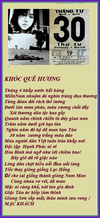 | NỖI BUỒN “Tháng Tư Đen”! Hằng năm cứ đến tháng tư, Bao nhiêu ký ức ưu tư lại về, Mọi người chộn rộn mọi bề. Nửa đi,nửa ở không mê cách nào. Đi thì có sự nghiệp làm sao? Bao nhiêu công sức đã bao năm dài, Ở thì lai sợ có ngày… Việt Cộng vào chiếm họa tai không lường. Đồ dùng vất tháo đầy đường. Vài nơi tiếng súng bâp bùng nổ rang. Lệnh thiết quân lực đã ban, Mọi người hồi hộp ở an trong nhà. Tướng Minh”lệnh “buông súng ban ra.. Đầu hàng Bức Tử thật là thương tâm! Anh hùng chiến sĩ âm thầm, Quyết định tử tiết không làm Cộng nô. Ngày nay ta vẫn tung hô, Anh hùng, chiến sĩ cơ đồ lưu danh. Công chữa đạt ,mà danh đã thành. Khí phách ngàn xửa rành rành giống nhau. Con cháu nối tiếp mai sau, Năm châu bốn biển phương nào cũng ghi! Đừng vì tiền bạc rồi thì… Làm tay sai ủy mị, “ra đi “dân cười! Lúc nầy ta chẳng an vui, Bao nhiêu buồn khổ phải lùi cho mau. Rốt tâm cầu nguyện đồng bào Nguôi cơn đau khổ, bệnh vào cút xa. Niềm vui trở lại mọi nhà… Dẹp tan buồn khổ, lòng ta MỞ CỜ! Trang Ngọc Kim Lang |
