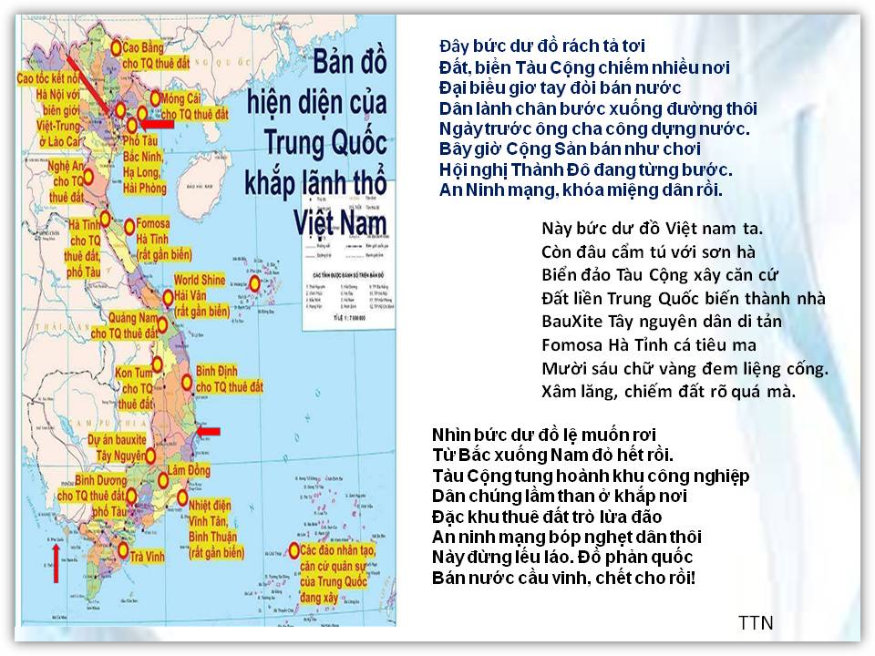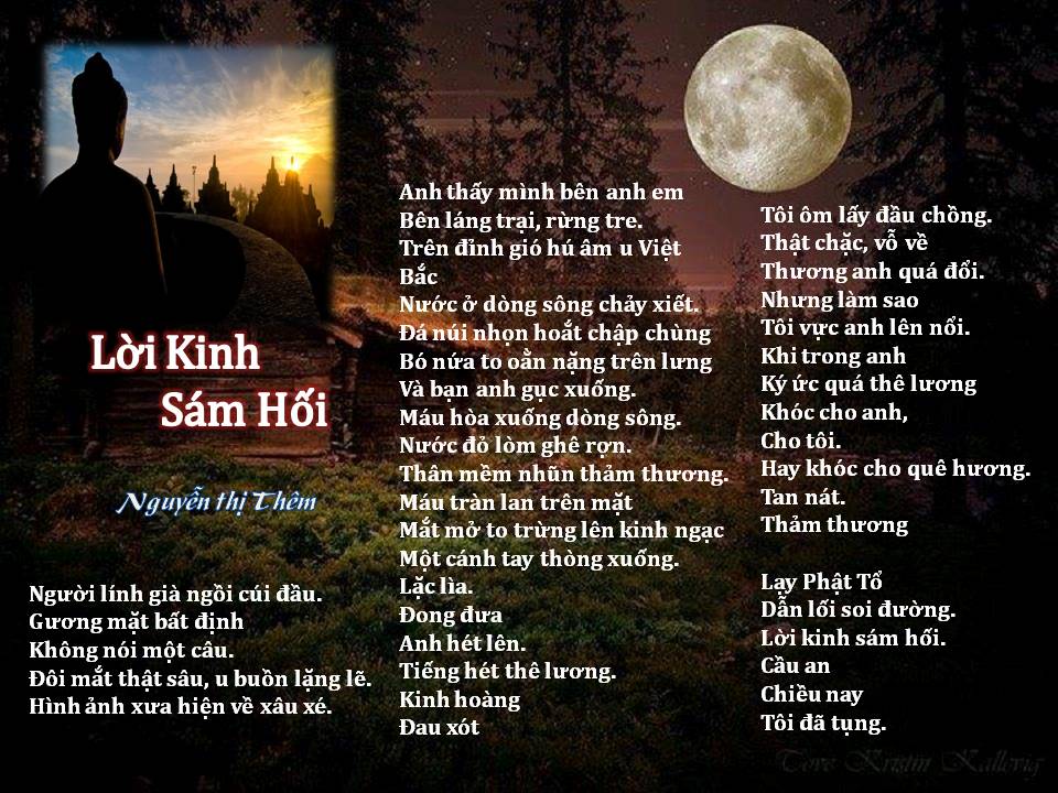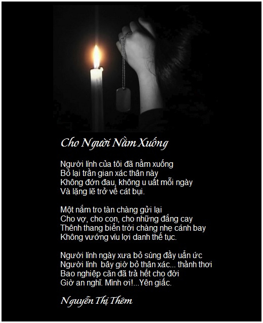 | Time I was born in the land of love where we called the Pearl of the East with great mountains and beautiful rivers with people who are simple but dedicated. But the dream of peace keeps slipping away as the Northerners invaded our land. Many losses. Many families suffered, asphyxiated by the emptied promise of liberty. Democracy, human rights are detained in dark cells as the enemy continues to attack our ancestry, our way of life and destroy our 4000-year culture. More than four decades I am still longing for justice released from the deep dungeon to break the chains of slavery and remove the foreign sacks. When will my homeland attain democracy for the flame of liberty burns brightly? When will my people achieve happiness and sing the notes of justice and compassion? My tears flow with my awaken soul When will, when will the time come? Thanh Sơn |