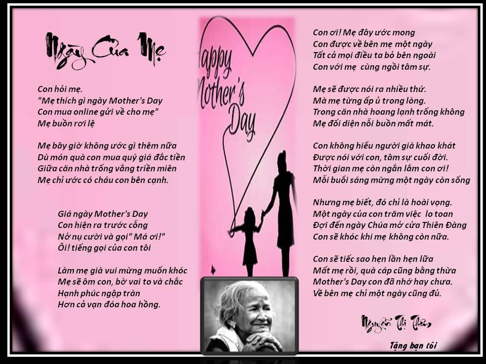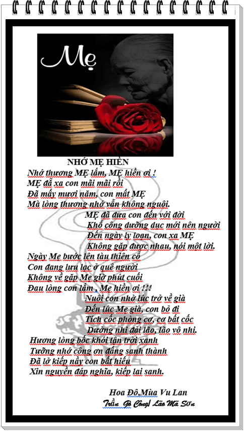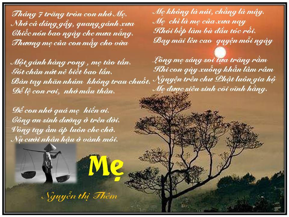 | Vu Lan nhớ Mẹ Mùa báo hiếu con không về thăm Mẹ Thắp nén hương ngôi mộ nhỏ lưng đồi Quê nghèo ấy nay đã quá xa xôi Nhớ thương Mẹ tim quặn đau nhỏ lệ Mẹ đã mất mười năm hơn có lẻ Sao dường như Mẹ vẫn mãi bên đời Vẫn vẳng nghe tiếng Mẹ hát ầu ơi Ru con ngủ những ngày còn thơ dại Đêm hôm ấy con vẫn còn nhớ mãi Phút lâm chung Mẹ nắm chặt tay con Môi thì thào những lời cuối không tròn “Đừng khóc nữa con ơi đừng khóc nữa” Mẹ đi rồi con mất nơi nương tựa Nơi xứ người thân lạc lõng bơ vơ Thèm làm sao những đêm tối trăng mờ Gặp lại Mẹ trong giấc mơ êm ái… phamphanlang |