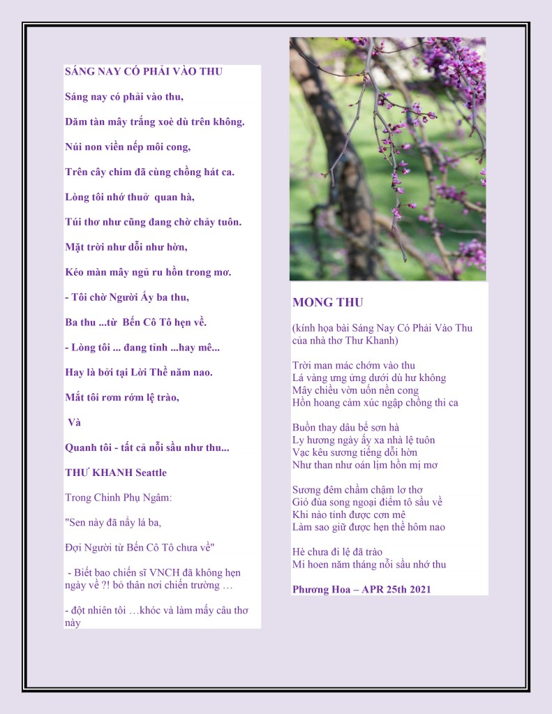CHUÔNG VIỆT XỨ NGƯỜI (Kính họa bài “Vui Tình Chữ Nghĩa” của chị Cao Mỵ Nhân) MỴ NHÂN VĂN BÚT khởi đầu MIỀN ĐÔNG HỒNG THỦY rực mầu thắm chương Về đây hoa lá tỏ tường Trời thanh cảnh mỹ vấn vương lòng này Văn thơ không rượu mà say Tay tiên bút ngọc ngày ngày đêm đêm Lung linh ngôn ngữ tìm em Lời hay ý đẹp triền miên gửi vần Tình nơi HẢI NGOẠI bao năm HOA KỲ độ ấy tim nằm muôn hoa Bốn phương gió thuận mưa hòa VIỆT NAM nguồn gốc cát sa văn tài Từ nay kết mối duyên hài Giúp nhau trổi bước văn đài tiến lên Trăm hoa đua nở tự nhiên Xứ Người Chuông Việt Vọng Nguyên Quốc Hồn Phương Hoa – NOV 18th 2020 |