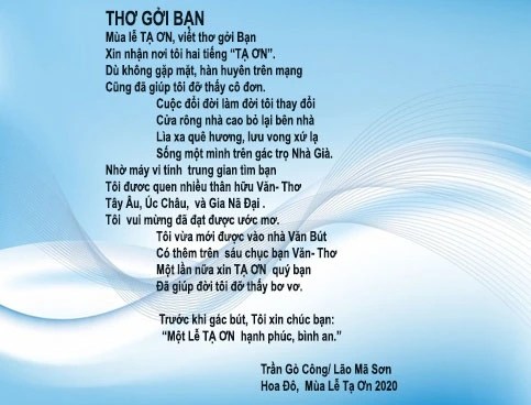 | Bạn Bè Quanh Ta Bạn bè trang lứa đếm đầu tay Xuân đến khắp miền có những ai Tìm dịp gần nhau vui hiếm có Mừng vui ngày một, kéo ngày hai. Chất xám cao niên cũng cạn dần Lắm người sức khỏe yếu lần lần Nghiệm xem giải trí môn nào hợp Cờ tướng, domino, thú nghệ nhân. Tinh thần yếu,sức khỏe lùi theo Thể dục tinh chuyên, nhưng chớ leo… Có sức tới đâu làm tới đó Bạn bè, chồng vợ giúp chống chèo Rỗi ra rảo bước đến thăm nhà Chờ mãi hẹn lâu mới thấy ra Bốn cẳng, ba chân khua lộp cộp Xe lăn, gậy chống bạn mừng ta Ngẫm nhìn bao kẻ kém may hơn Phải sống vui tươi, đùa nghịch giỡn Đừng để giận hờn luôn lởn vởn Thân tâm thanh thản, trí không lờn Mong rằng năm mới mọi người vui Làm việc thảnh thơi, tránh ngậm ngùi Dĩ vãng thăng trầm luôn xả bỏ Cho đi lơn lại phải cười tươi Trang Ngọc Kim Lang |