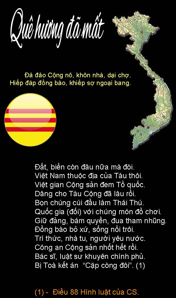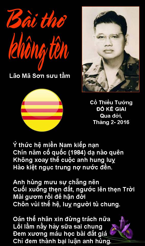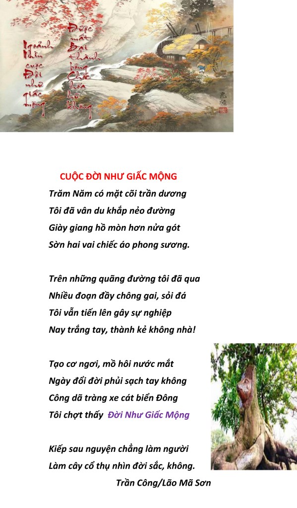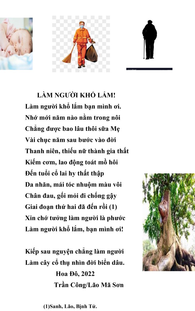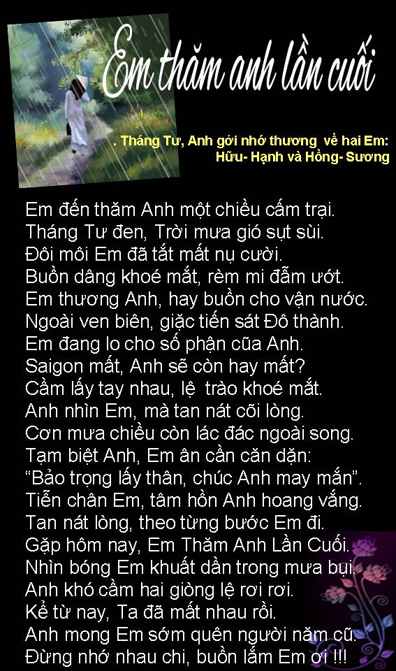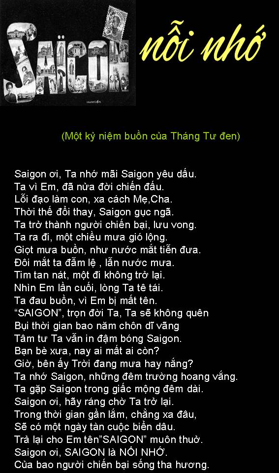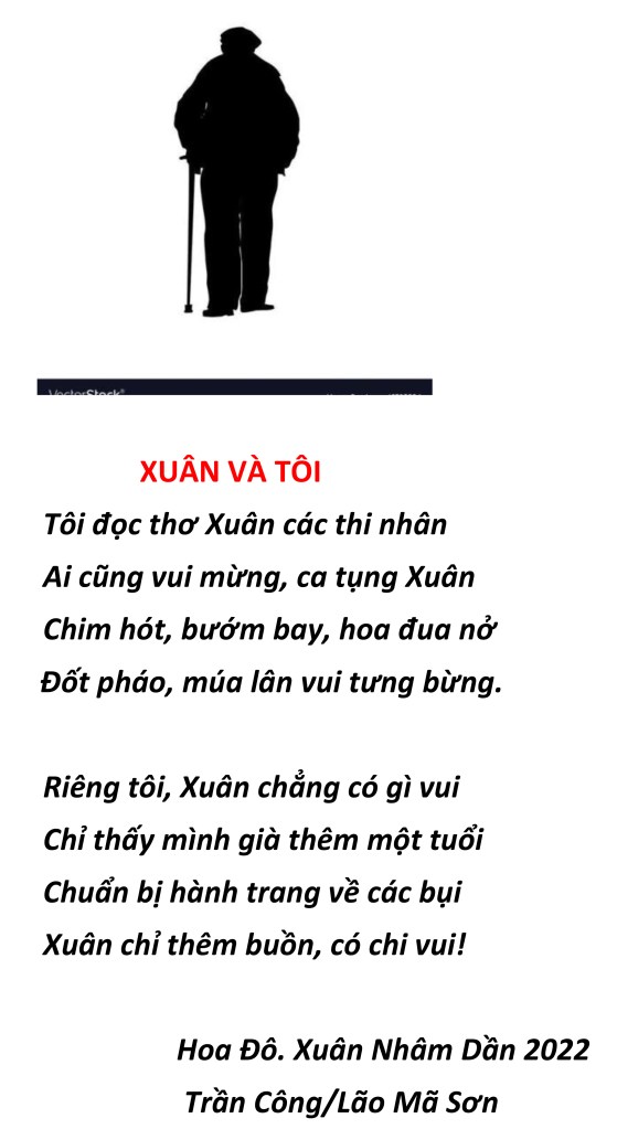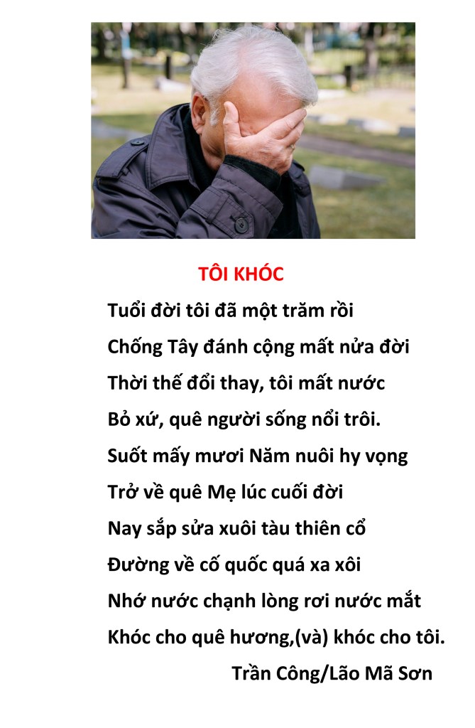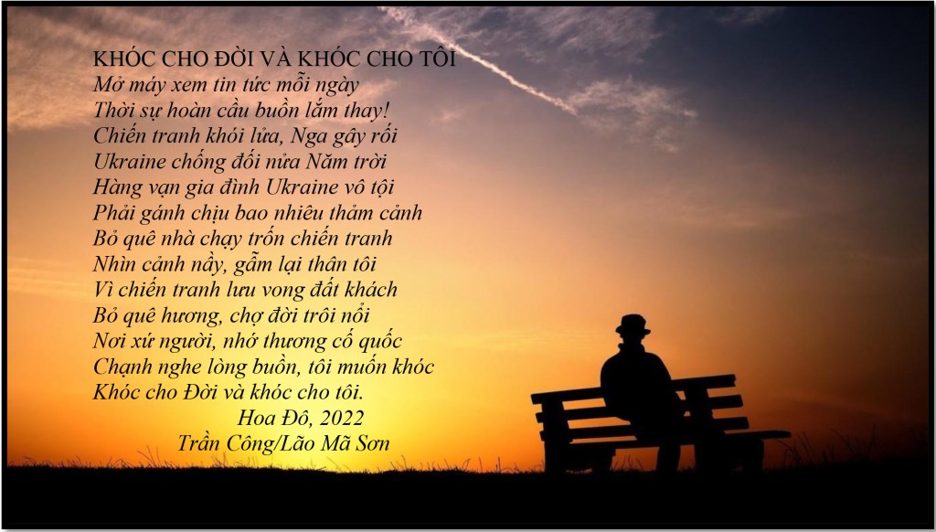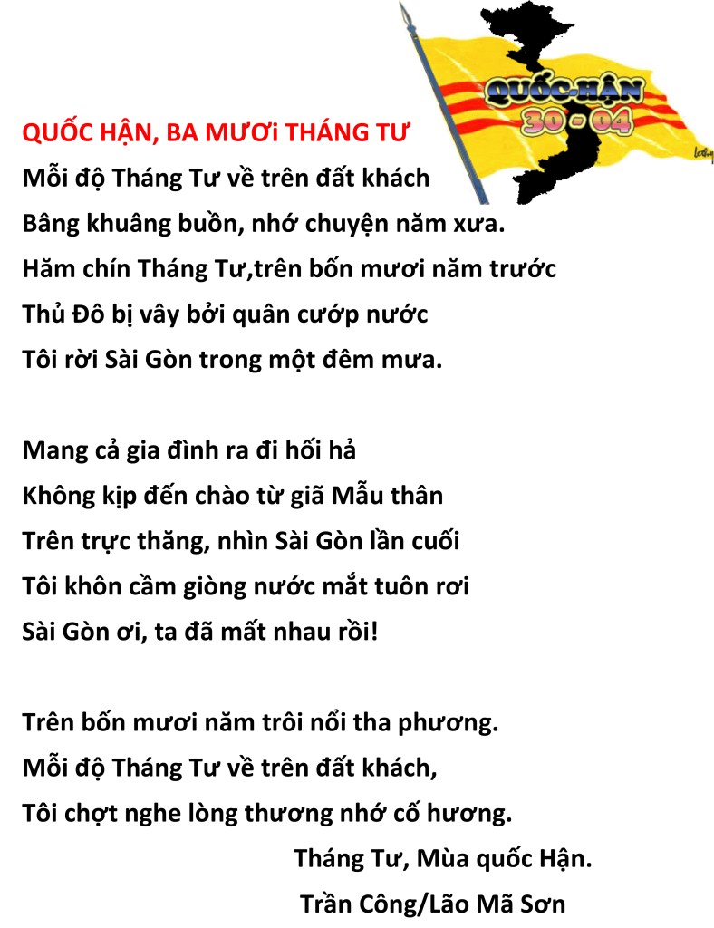 | NỖI BUỒN THÁNG TƯ Nỗi buồn xa xứ tưởng nguôi ngoai Ngờ đâu trở lại Tháng Tư nầy Buồn vì thân phận người chiến bại Bỏ quê hương, hải ngoại dung thân Chưa biết ngày trở về cố quốc. Tuổi đời nay đang đến cuối đường Buồn cho ngày giã từ trần thế Thân xác thành cát bụi tha hương. Hoa Đô, tháng Tư, 2022 Trần Công/Lão Mã Sơn |