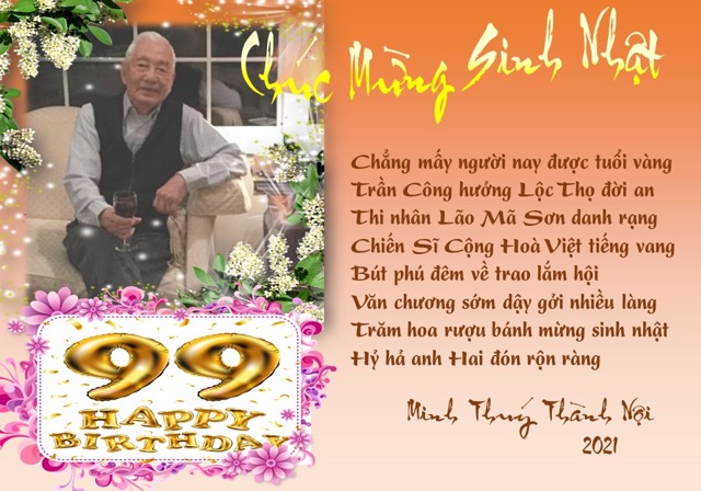 | Cô Út Kim Oanh kính tặng món quà Thơ Tranh mừng sinh nhật Thượng Thọ 99 tuổi của anh Hai Trần Công. Kính chúc anh dồi dào sức khỏe, hạnh phúc bên con cháu và vui Thơ cùng bạn hữu. Thơ: Trần Công/Lão Mã Sơn Thơ Tranh: Kim Oanh |