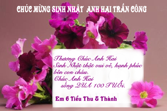 | (Gia Đình anh Trần Gò Công-Lão Mã Sơn -Việt Nam) Người ta tuổi hạc sức tàn Anh Hai chín chín vẫn tràn nhựa xuân Đường trần lắm chuyện tai ương Chưa khô dòng lệ khóc thương bạn đời Lại sầu ly biệt con côi Tre còn măn mục hỡi ôi phận mình Đèn khuya một bóng với hình Sương sa người lạ tội tình chiếu chăn Mới ngày nào được thăng quan Đệ Ngũ Đẳng Bảo Quốc vẻ vang đời Bây giờ non nước xa vời Quê cha đất tổ một trời tóc tang Hiền thê ơi đây trăng vàng Em đi trước để ngỡ ngàng cho anh. Nhìn con thơ yếu đầu xanh Ngày mai anh phải đấu tranh với đời Lo cho các con nên người Dẫu thân tàn tạ miễn đời con sung … Hiền thê ơi hết mong chờ Thuyền con mình đỗ bến bờ vinh quang Đêm nay dưới ánh trăng vàng Về chia sinh nhật muộn màng với anh. Viết tặng anh Hai Trần Công và kính chúc anh sinh nhật 99 toàn vẹn. Kính quý, Em Cao Minh Nguyệt(Em 3) |