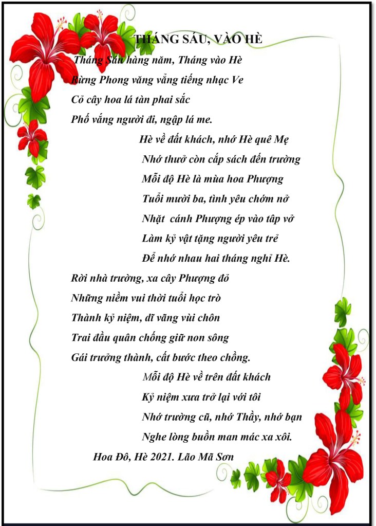 | HÈ HOA ĐÔ Mỗi năm vào tháng Sáu Nghe tiếng nhạc Ve sầu Nắng Hè như đổ lửa Trên khắp vùng Hoa Đô. Đứng tựa bên song cửa Nhìn cảnh vật bên ngoài Nghe lòng bâng khuâng nhớ Nhưng chẳng biết nhớ ai. Ngắm Hè trên đất khách nghe lòng buồn mông mênh Buồn nỗi buồn không tên. Cốc wine cầm trên tay Nhớ Hè xưa quê Ngoại Chưa uống, hồn như say. Hoa Đô, 21-6-2022 Trần Công/Lão Mã Sơn |