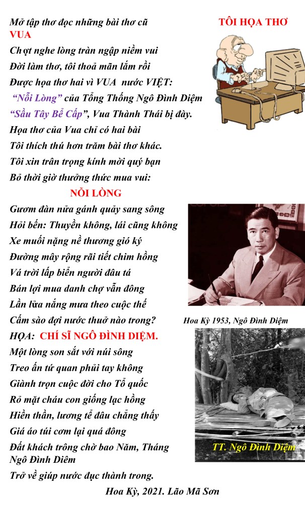 | NỖI LÒNG Thời gian hờ hững cứ dần trôi Lại một Năm qua nữa đây rồi ! Mới ngày nào đó còn xanh tóc Mái đầu nay đã trắng như vôi. Đất khách lưu vong, hờn chiến bại Lắm nỗi đắng cay cuộc đỗi đời Ai cũng tưởng tôi yêu đời lắm Nào ai biết được nỗi lòng tôi. Nhiều đêm thao thức, buồn nhớ nước Âm thầm lau giọt nước mắt rơi Tháng, Năm dài lòng hằng mơ ước Nằm vào (lòng) đất Mẹ, lúc qua đời. 31-12-2021 Trần Công/Lão Mã Sơn |