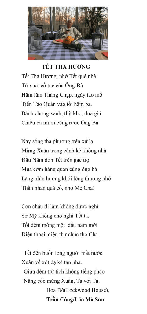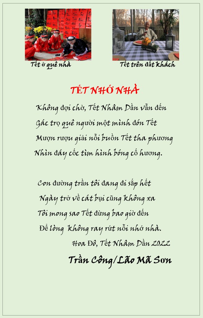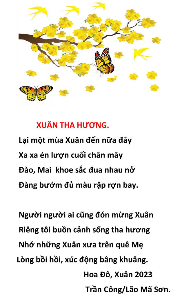 | TẾT THA HƯƠNG Tết Tha Hương, nhớ Tết quê nhà Từ xưa, cổ tục của Ông-Bà Hăm lăm Tháng Chạp, ngày tảo mộ Tiễn Táo Quân vào tối hăm ba . Bánh chưng xanh, thịt kho, dưa giá Chiều ba mươi cúng rước Ông Bà. Nay sống tha phương trên xứ lạ Mừng Xuân trong cảnh kẻ không nhà. Đầu Năm đón Tết trên gác trọ Mua cơm hàng quán cúng ông bà Lặng nhìn hương khói lòng thương nhớ Thân nhân quá cố, nhớ Mẹ Cha! Con cháu đi làm không đươc nghỉ Sở Mỹ không cho nghỉ Tết ta. Tối đêm mồng một đầu năm mới Điện thoại, điện thư chúc thọ Cha. Tết đến buồn lòng người mất nước Xuân về xót dạ kẻ tan nhà. Giữa đêm trừ tịch không tiếng pháo Nâng cốc mừng Xuân, Ta với Ta. Hoa Đô, Xuân Quý Mão 2023 Trần Công/Lão Mã Sơn |