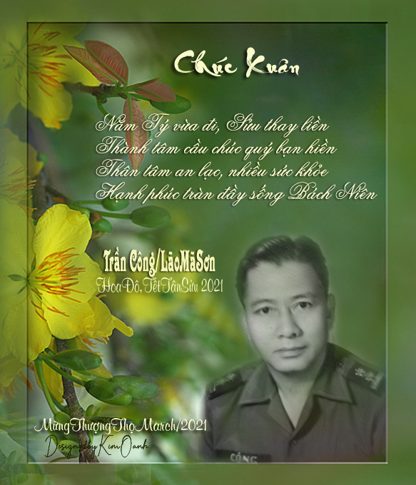 | * Tiểu Sử Trần Văn Công, sanh ngày 10-3-1923, tại Tỉnh Gò Công, Nam Việt Nam. Bút hiệu Lão Mã Sơn, Công Trần, Trần Gò Công, Trần Công-Tiền Giang Tử. Lập gia đình có 6 người con: 3 trai, 3 gái. Hiền thê đã qua đời, hiện nay đang cư ngụ một mình trong căn Apartment của chung cư Lockwood House, ở Quận Arlington, Tiểu Bang Virginia, Hoa Kỳ. * Sự Nghiệp: Phục vụ trong ngành công lực của Chánh Phủ Việt Nam Cộng Hòa, 21 năm (Hiến Binh Quốc Gia và Cảnh Sát Quốc Gia). * Các Chức Vụ Đã Từng Giữ: – 1954, Phó Trưởng Ty Cảnh Sát Vĩnh Long (Trưởng Ty là người Pháp tên Nogues) – 1955, Trưởng Ty Hiến Binh Quốc Gia (HBQG), kiêm Cảnh Sát Trưởng, CST Tây Ninh – 1956, Trưởng Ty Hiến Binh Quốc Gia kiêm CST Thủ Dầu Một – 1965 -1959, Trưởng Ty Hiến Binh Quốc Gia kiêm CST Bà Rịa – 1959-1961, Trung Đội Trưởng (Sĩ quan Thanh tra) HBQG liên Tỉnh Quảng Ngãi-KonTum – 1962 Tu nghiệp 6 tháng tại Hoa Kỳ - 1962-1964, Mãn khóa tu nghiệp, hồi hương, làm Phó Giám Đốc Trung Tâm Huấn Luyện Hiến Binh Quốc Gia Đà Lạt – 1964-1965,Trung Đội Trưởng (Sĩ Quan Thanh Tra) Hiến Binh Quốc Gia liên Tỉnh Vũng Tàu-Bà Rịa-Long Khánh. Cuối năm 1965, vì không được Mỹ tài trợ, ngành Hiến Binh Quốc Gia bị giải tán. Nhân sự của Hiến Binh Quốc Gia được chuyển qua ngành Cảnh Sát Quốc Gia. – Cải ngạch với cấp Biên Tập Viên Thượng hạng (Tương đương cấp Thiếu Tá) – 1966-1968, Cảnh Sát Trưởng Quận Tân Bình (Trực thuộc Ty Cảnh Sát Quốc Gia Gia Định) – 1958-1971Phó Trưởng Ty Cảnh Sát Quốc Gia Quận Nhứt, Đô Thành Sài Gòn – Trưởng Ty Cảnh Sát Quốc Gia Vũng Tàu (1971-1972). – 1972-1973 Thăng cấp Trung Tá, làm Chỉ Huy Trưởng Cảnh Sát Quốc Gia (Danh xưng cũ là Trưởng Ty) Quận Tư, Thủ Đô Sài Gòn – Chỉ Huy Trưởng Cảnh Sát Quốc Gia Quận 6, Sài Gòn cho đến ngày 30-4-1975. Năm 1975 tị nạn tại Hoa Kỳ. * Được Ân Thưởng: – Đệ ngũ đẳng Bảo Quốc Huân Chương. – Chương Mỹ Bội Tinh (Huân chương Hành Chánh cao quý nhất). * Sinh Hoạt Văn Học. Bắt đầu tập tành làm thơ khi còn học cấp Trung học. Sau khi tốt nghiệp Trung học, vì bận sinh kế, cho nên ngưng làm thơ mãi cho đến năm 2003 mới bắt đầu sáng tác lại cho đến nay, để giải khuây và vận động trí não lúc tuổi già. Đã sáng tác thơ văn trên 20 năm, gom thành nhiều tác phẩm, nhưng chưa in ra sách. Tác Phẩm: ghi vào Google “Flifbook các Thi tập của Trần Gò Công, Lão Mã Sơn”. https://anyflip.com/almib/rivc/basic * Các Diễn Đàn Đã Cộng Tác: – Hội Văn Bút Việt Nam Hải Ngoại Trung Ương Hoa Kỳ: https://vietpen.org/home-2/ – Hội Văn Bút Việt Nam Hải Ngoại Vùng Đông Bắc Hoa Kỳ: https://vbmdhk.org/ – Long Hồ Vĩnh Long Blogspot: https://longhovinhlong.blogspot.com/ – Hướng Dương website. |