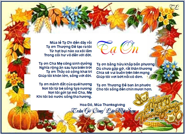 | Tạ Ơn Mùa lễ Tạ Ơn đến đây rồi Tạ ơn Thượng Đế tạo ra tôi Từ hạt bụi nào xa xôi lắm Trong cõi hư vô đến với đời. Đã ban ân phước cho tôi sống Đến nay tuổi đã quá trăm rồi. Tạ ơn Cha Mẹ công sinh dưỡng Nghĩa rộng ân sâu tựa biển trời Tạ ơn Thầy có công khai trí Giúp tôi khôn lớn, sống với đời. Tạ ơn mảnh đất của quê hương Nơi tôi từ bé sống tựa nương Nơi tôi gởi lại mồ Cha, Mẹ Khi tôi bỏ nước sống tha hương. Tạ ơn bằng hữu khắp bốn phương Dù chưa gặp mặt, rất thân thương Chia sẻ vui buồn trên liên mạng Giúp tôi vơi bớt nỗi cô đơn. Hoa Đô (Locwood House) Trần Công/Lão Mã Sơn |