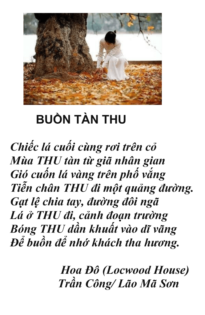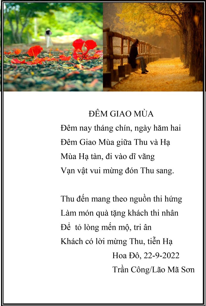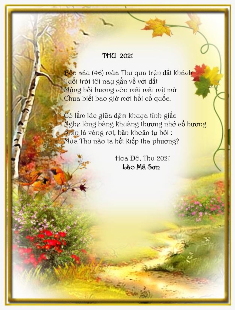 | THU VỀ GỞI NHỚ CHO NHAU Em yêu ơi ! Lại một mùa THU về trên viễn xứ Chiều chiều tựa cửa nhìn lá Thu rơi Tôi chợt nhớ người bạn lòng năm cũ Quê Mẹ THU về, Em có nhớ Tôi ? Anh yêu ơi ! Một mùa THU nữa về trên quê Mẹ Ta đã mất nhau mấy chục THU rồi Nhiều đêm tỉnh giấc giữa khuya vắng vẻ Em nhớ Anh nhiều, nhiều lắm Anh ơi ! Hoàn cảnh trái ngang, mỗi kẻ một nơi Góc biển chân trời bao năm xa cách Mỗi độ THU sang quê nhà, đất khách Có hai bạn lòng Gởi Nhớ Cho Nhau. Thu 2021, Lão Mã Sơn |