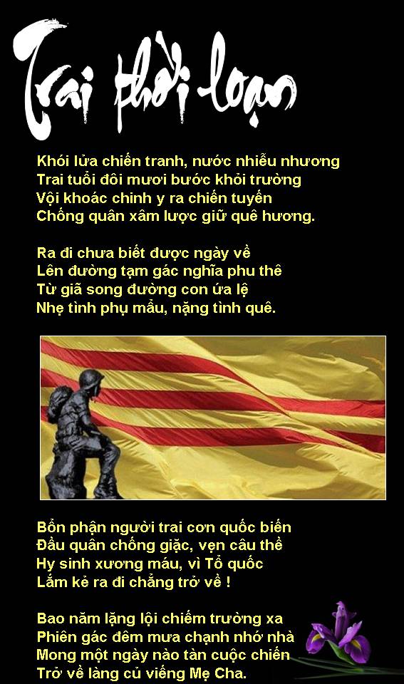 ![]() NGƯỜI CHIẾN SĨ TRẬN VONG khói lửa chiến tranh tắt đã từ lâu. Đất nước trải qua bao cuộc biển dâu Súng còn đây, mũ sắt cũng còn đây Người chiến sĩ chết bên bờ lao sậy Hồn bây giờ phảng phất ở nơi đâu, Bình Long, Đồng Tháp, hay cầu Hiền Lương? Người mất rồi yên vui miền an lạc Chiến hữu sống còn phiêu bạt bốn phương. Ôm mối hận lòng của người chiến bại Rời bỏ quê nhà sống kiếp tha hương. Trần Công/Lão Mã Sơn |