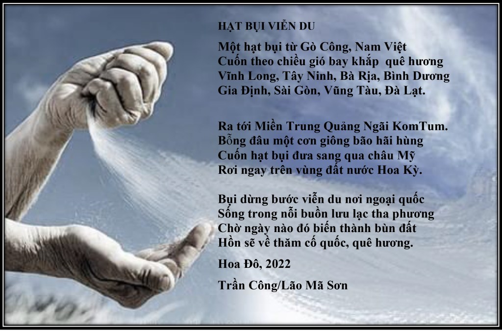 | Hạt Bụi Viễn Du Một hạt bụi từ Gò Công, Nam Việt Cuốn theo chiều gió bay khắp quê hương: Vĩnh Long, Tây Ninh, Bà Rịa, Bình Dương, Gia Định, Sài Gòn, Vũng Tàu, Đà Lạt Ra miền Trung Quảng Ngãi và KomTum. Bỗng đâu một cơn giông bão hãi hùng Cuốn hạt bụi đưa sang qua Châu Mỹ. Hạt bụi dừng chân trên nước Hoa Kỳ Gót giày giang hồ còn chẳng mấy ly Sờn cả hai vai chiếc áo phong sương Hạt bụi ngày càng mỏi mòn cơ thể Sống trong nỗi buồn thương nhớ cố hương. Trần Công/Lão Mã Sơn |